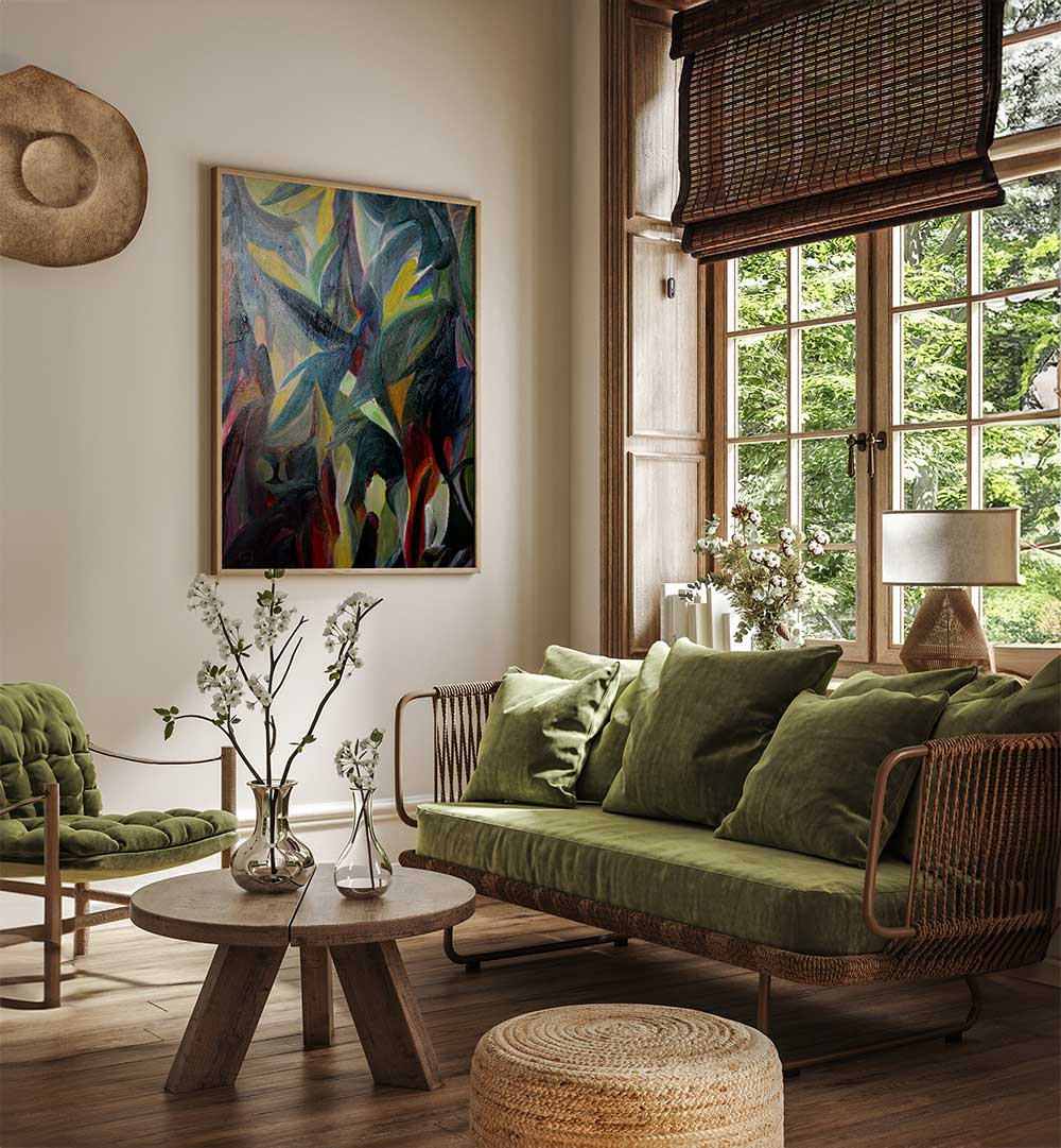 Pair Deep Woods with simple frames or gallery-wrap presentation to preserve its expansive feel. Place it where natural light or warm artificial light can move across the surface, revealing new nuances throughout the day.