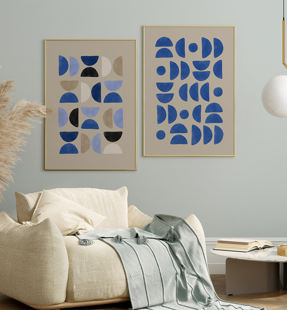 Modern living room with blue sofa, abstract wall art, and decorative items.