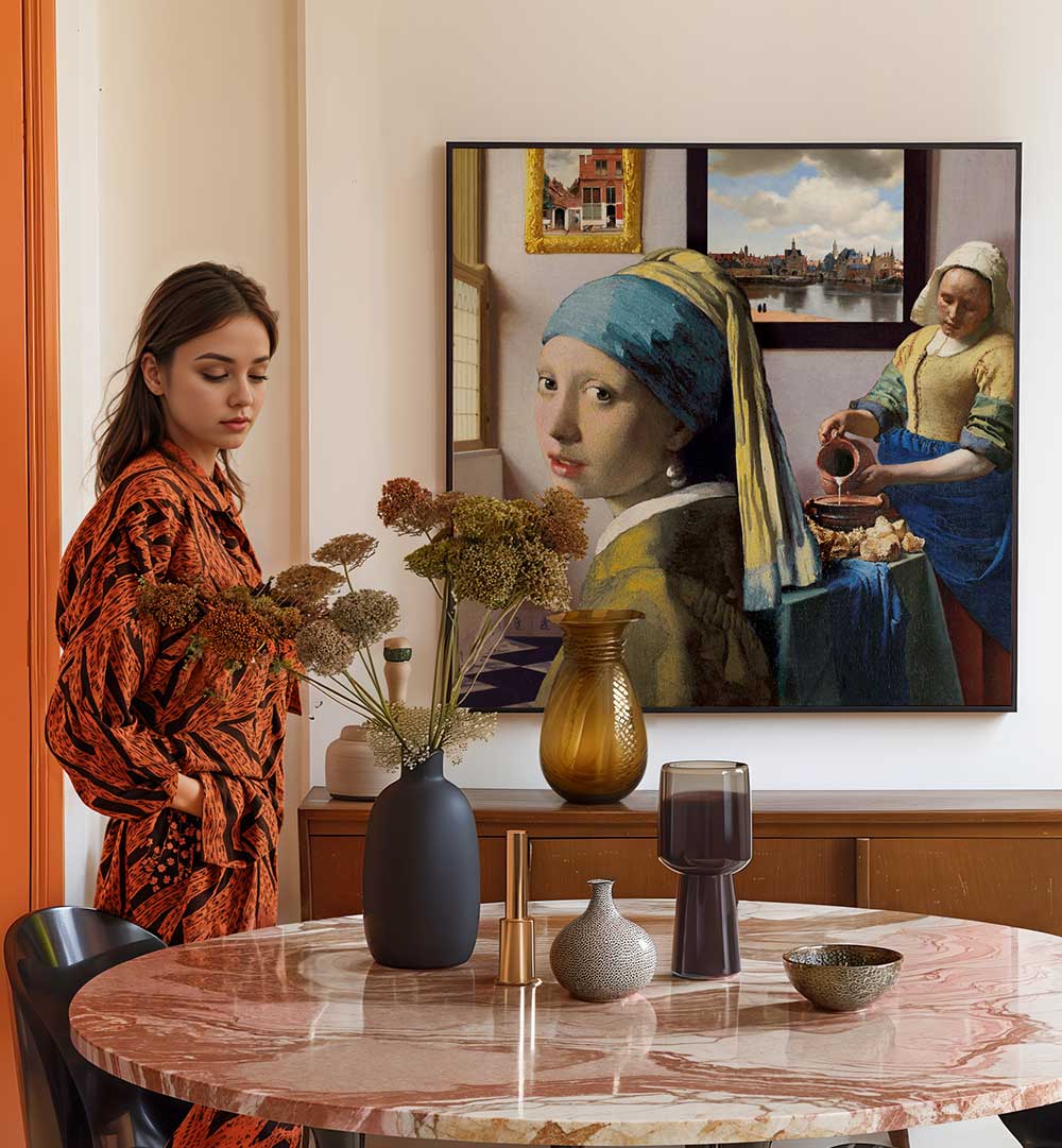 - Reimagined classics – Vermeer’s Girls reinterpreted with a contemporary, surreal twist.