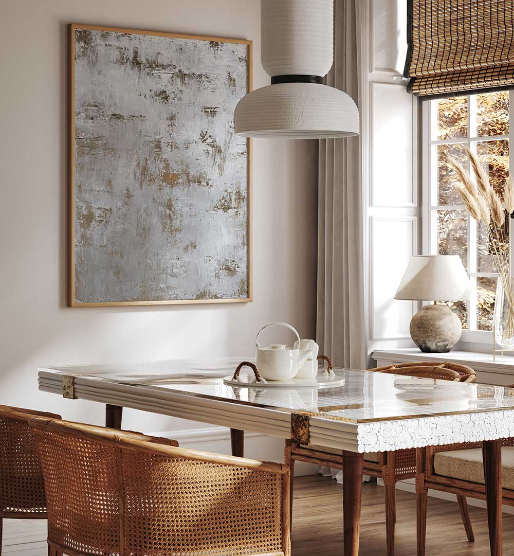 Modern abstract forms invite interpretation, offering a dynamic visual experience without overpowering the room.