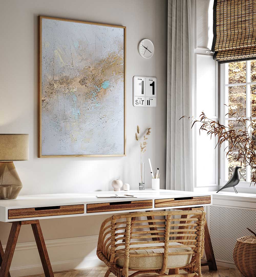 Experience ICED GOLD, a captivating collection of abstract paintings that fuses icy tones with radiant gold accents. This contemporary wall art adds a bold focal point to any space, from minimalist living rooms to sophisticated offices, delivering both visual intrigue and refined elegance.