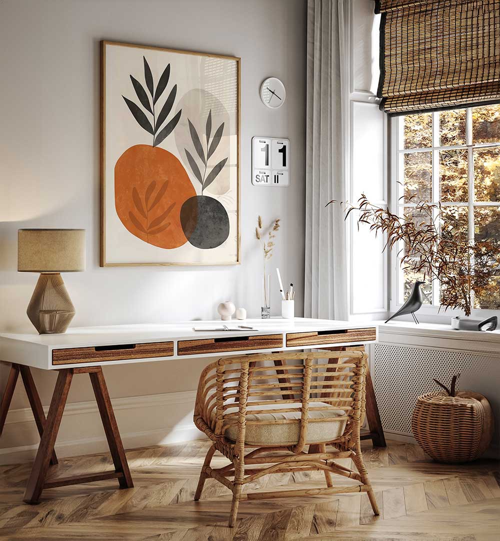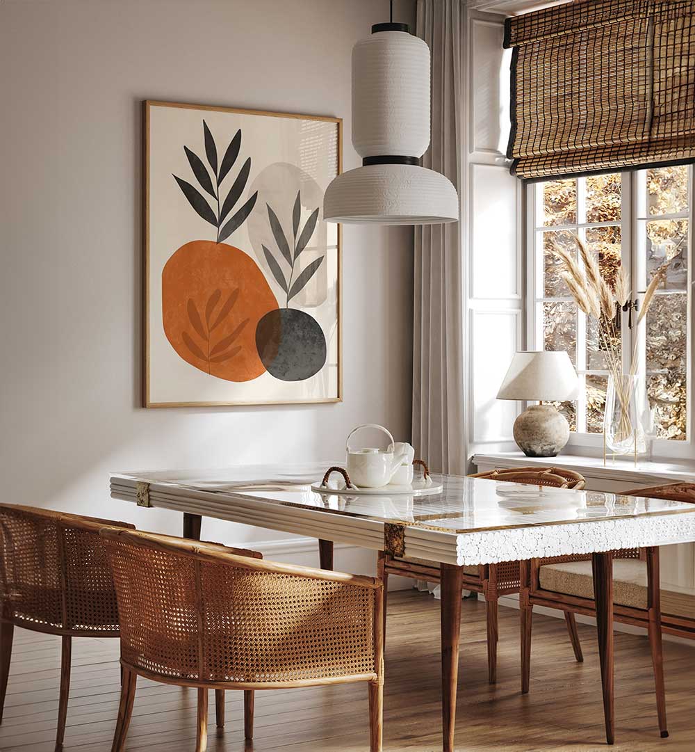 - Abstract shapes & botanical motifs create a versatile focal point that pairs beautifully with wood tones, natural fabrics, and greenery.