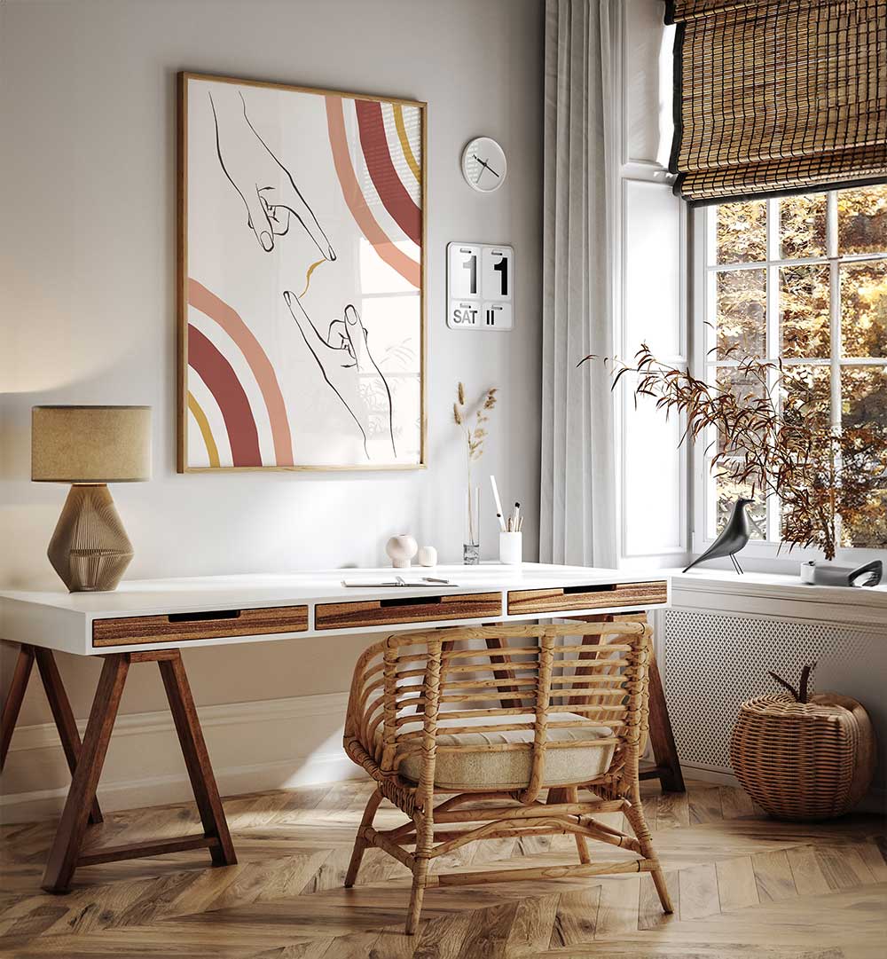 Discover HANDS CONNECT, a Boho Art Painting that captures the moment of unity with a stylized hands motif, rendered in warm, earthy tones. This piece blends modern lines with bohemian charm to create a statement artwork for any wall.