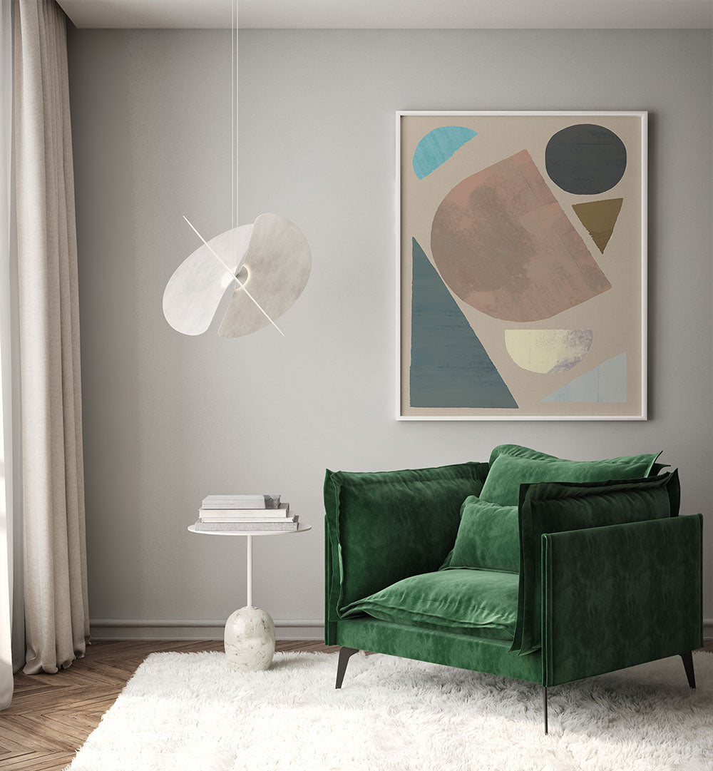 - Geometric abstraction in soft, muted hues that harmonize with neutrals, taupe, grey, and cream palettes