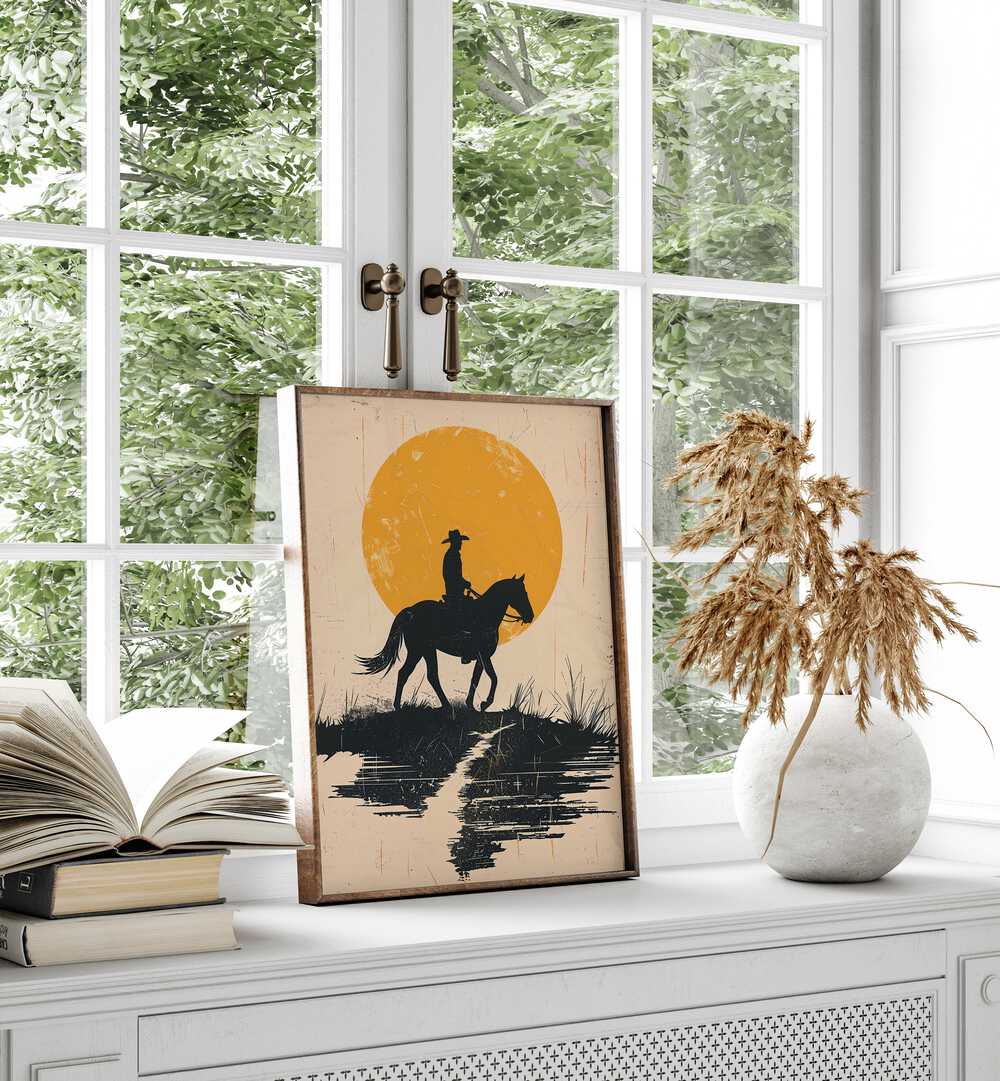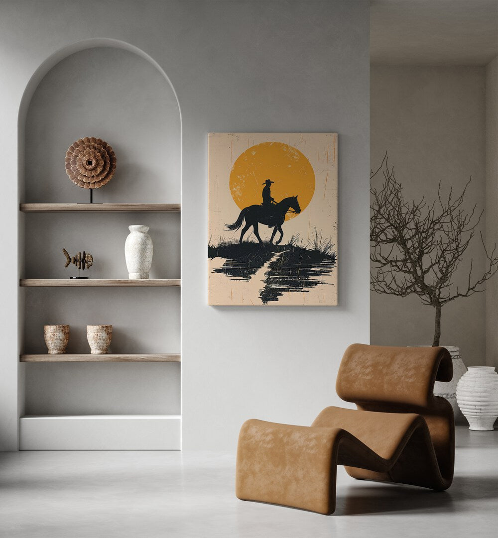 This artwork goes beyond decoration; it invites you to embrace the spirit of the West every day. The dramatic blend of sunset tones and the solitary rider creates a compelling focal point that complements rustic, industrial, and contemporary interiors alike.