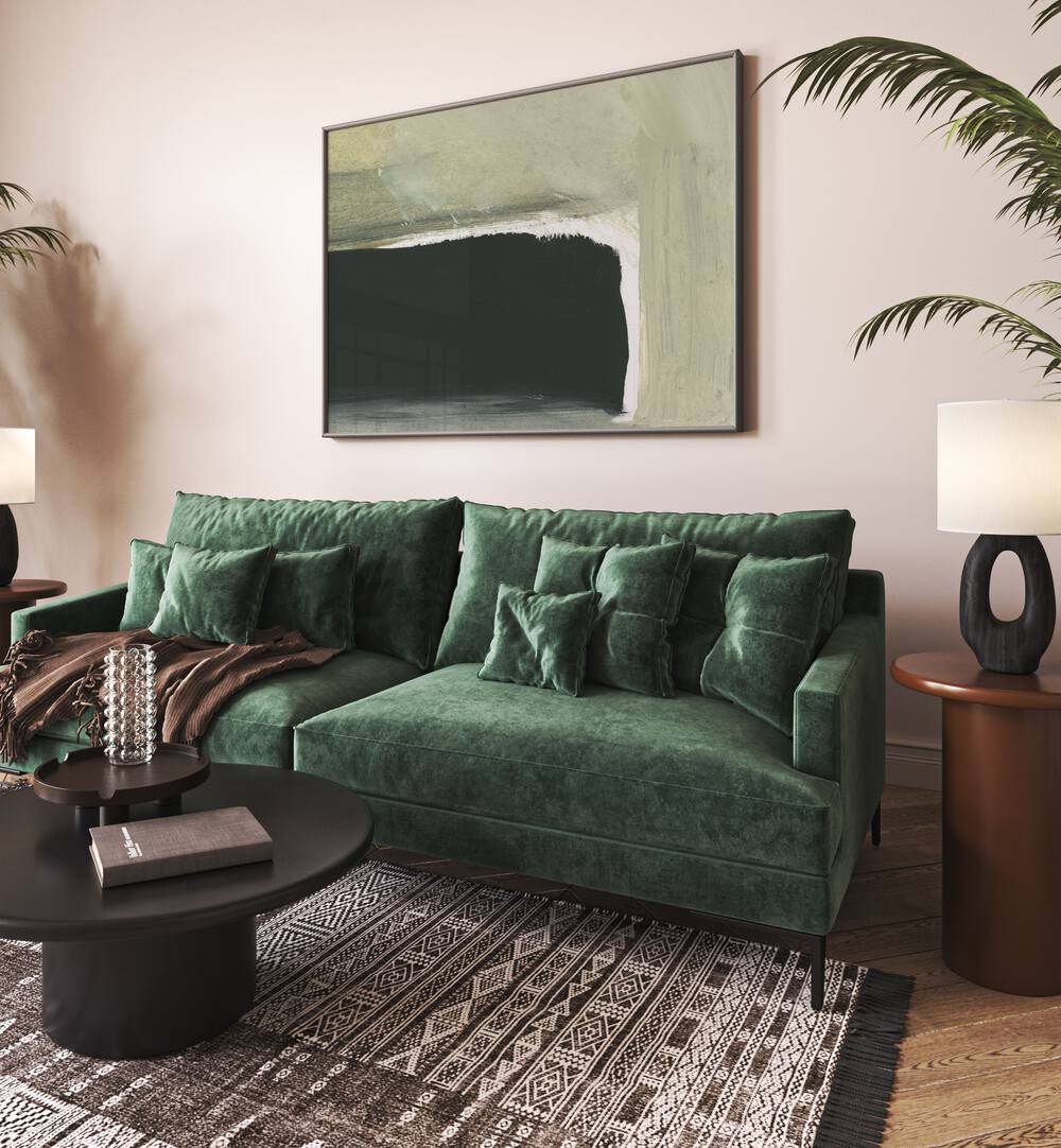 Stylish ROOM with a green sofa showcasing vibrant ABSTRACT PAINTINGS, perfect for enhancing modern interior design.