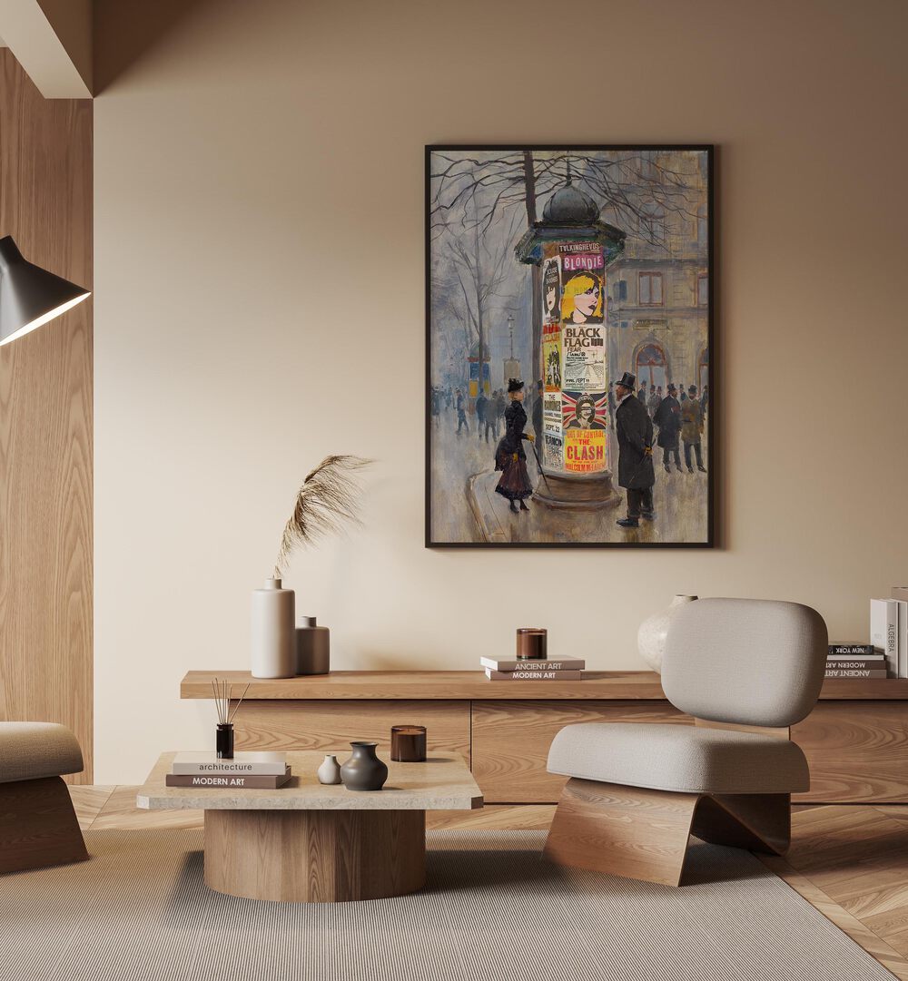 Punk Concerts, Altered Art Prints by Dikhotomy adorn a stylish living room, showcasing vibrant punk culture.