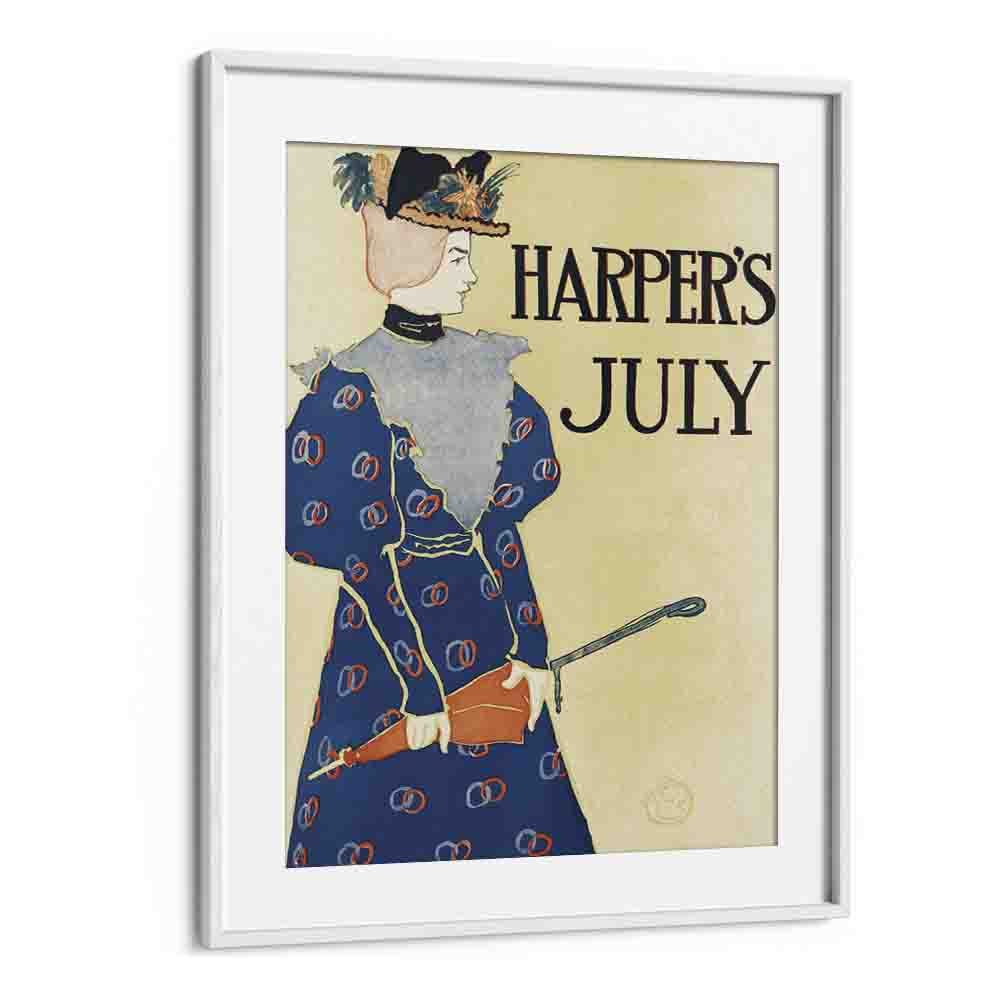 Step into the enchanting world of the past with our exquisite illustration titled HARPER'S JULY (1896). This stunning piece features a graceful woman holding an umbrella, encapsulating the elegance and sophistication of a bygone era.