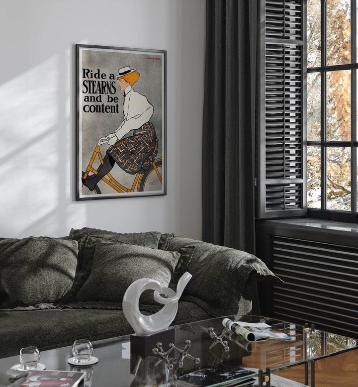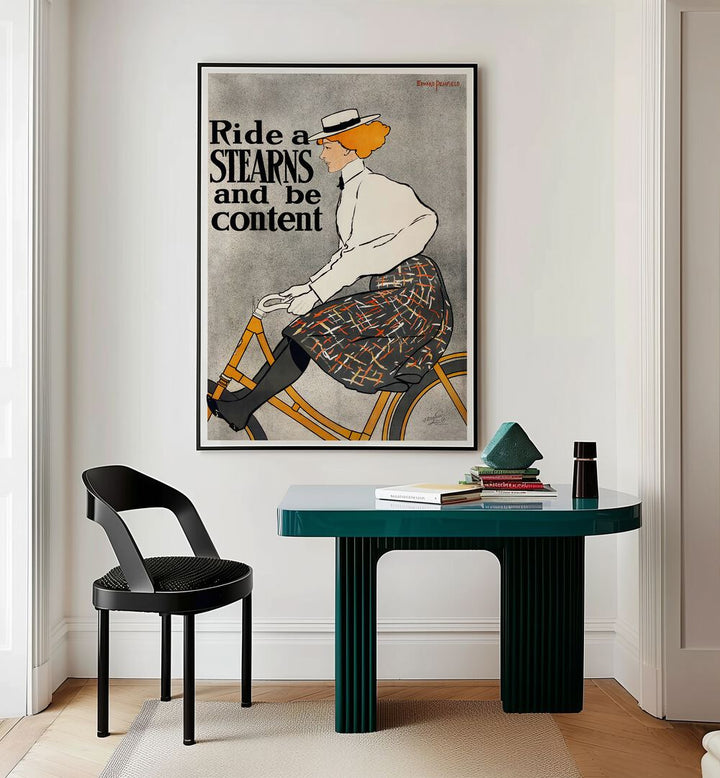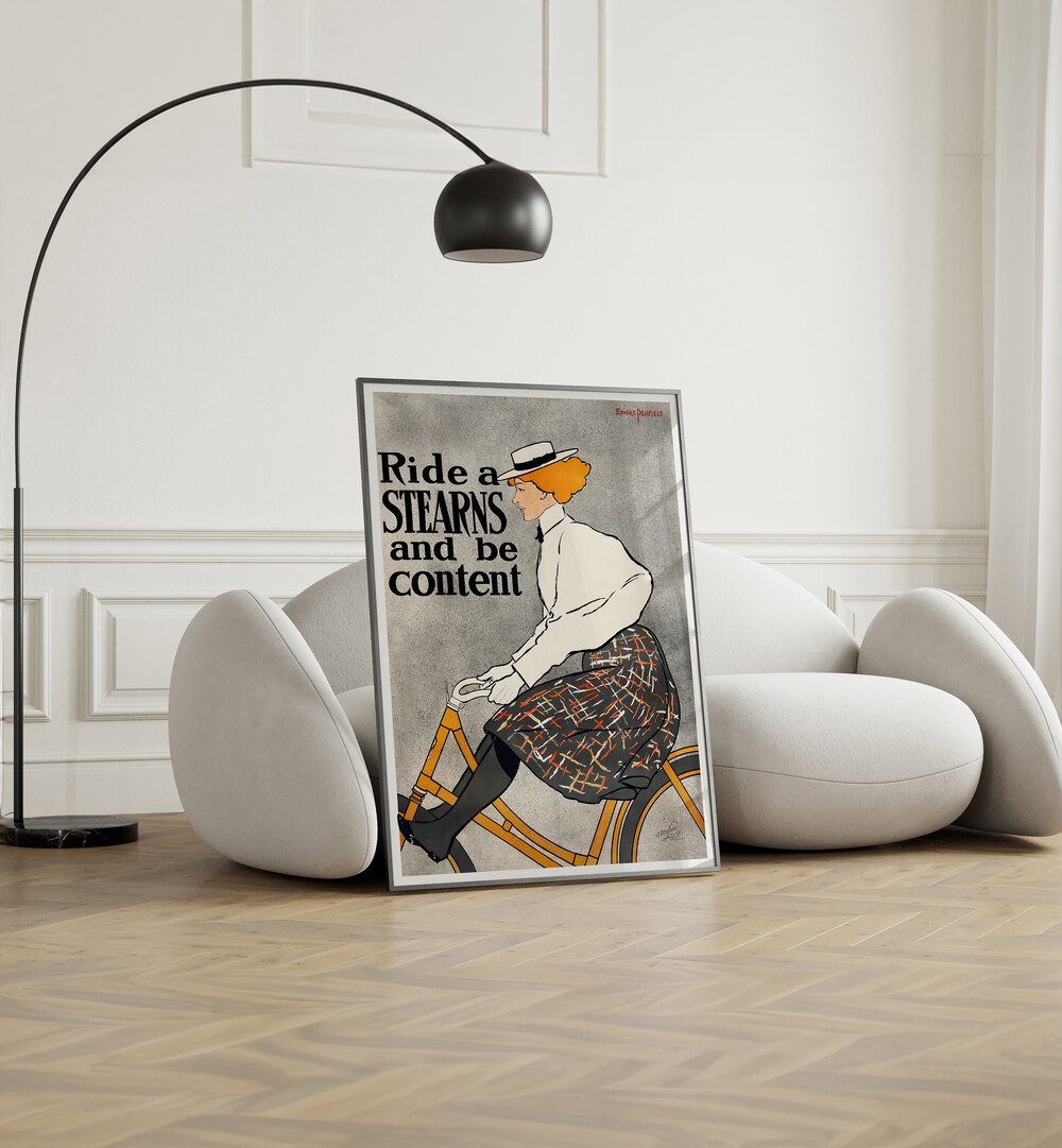 Step back in time with the exquisite vintage painting, RIDE A STEARNS AND BE CONTENT (1896). This captivating artwork not only showcases a beautiful era but also evokes a sense of nostalgia and tranquility.