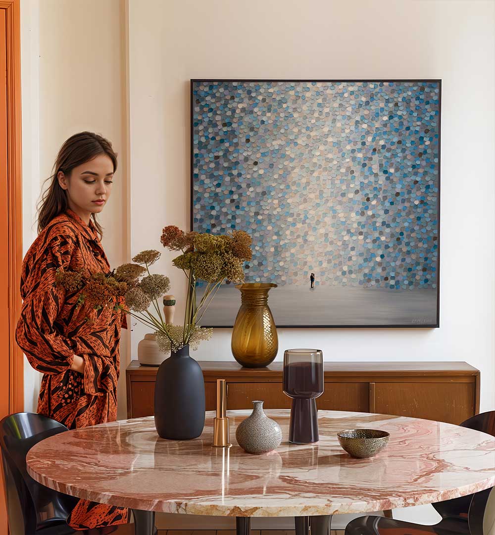 Designed for contemporary interiors, this work elevates living rooms, bedrooms, studios, and entryways with a sophisticated, cinematic mood. The harmonious balance of light and shadow adds depth to walls, turning blank space into a storytelling focal point.