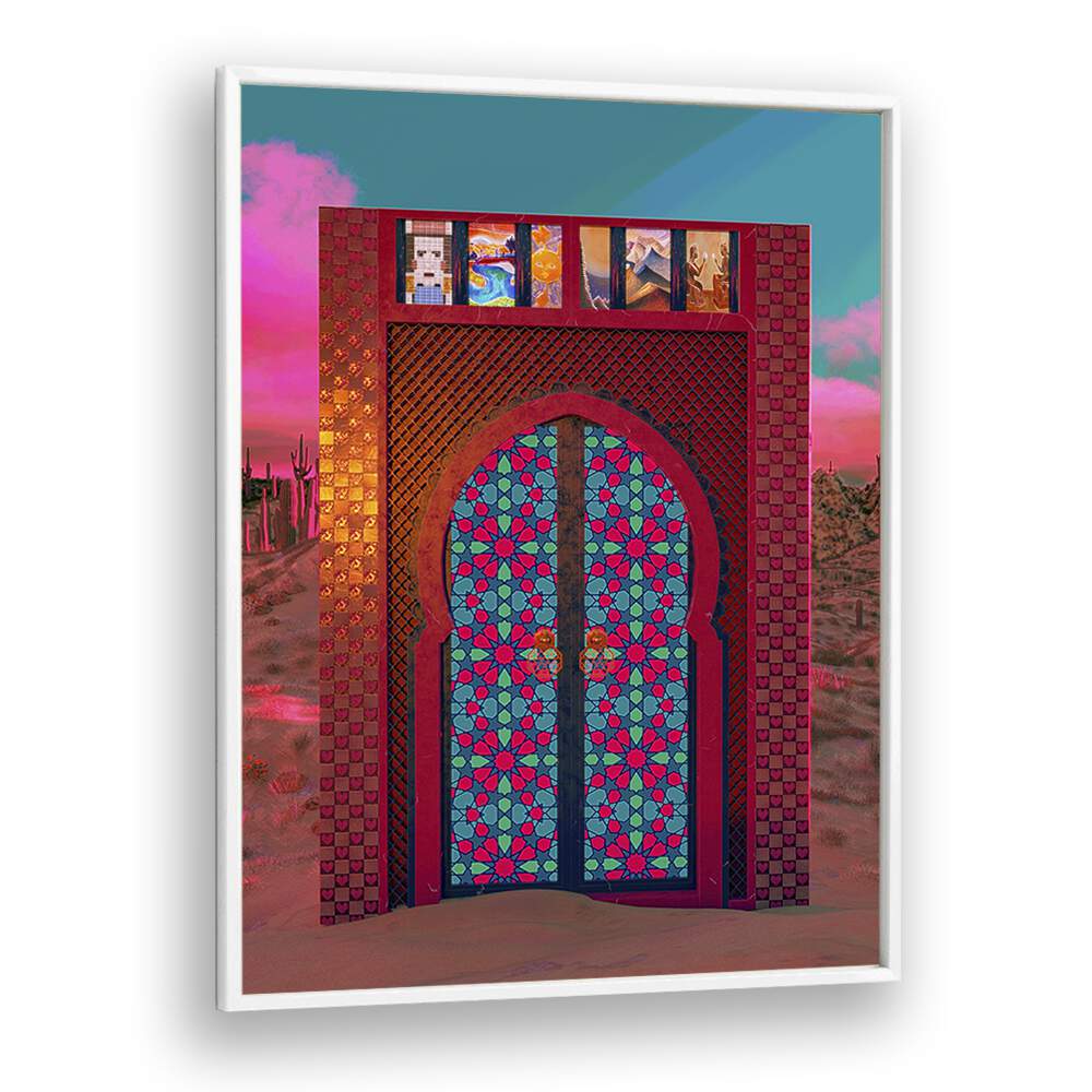 KHALID'S DOOR, SURREAL ART PRINTS by Cosmo Zach features a vibrant, intricate door design in a surreal landscape.