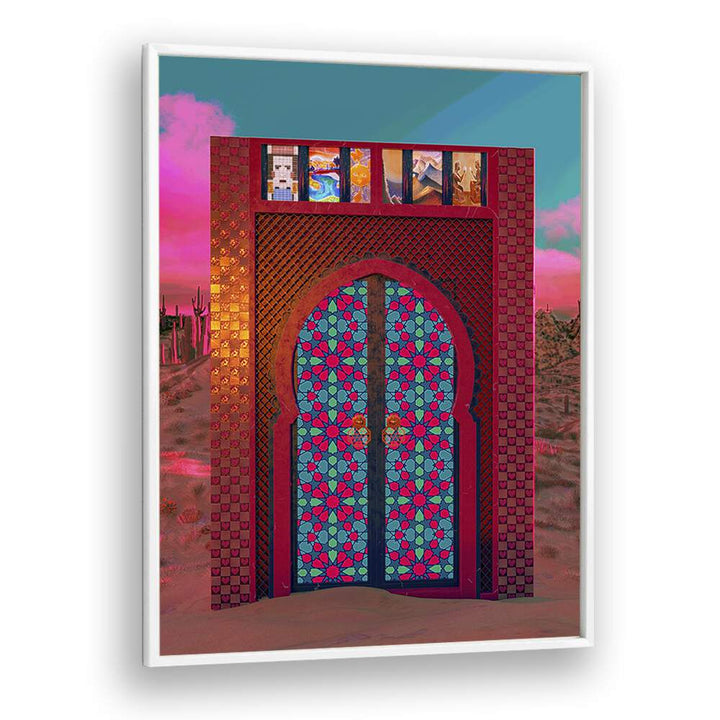 KHALID'S DOOR, SURREAL ART PRINTS by Cosmo Zach features a vibrant, intricate doorway framed in a stunning landscape.