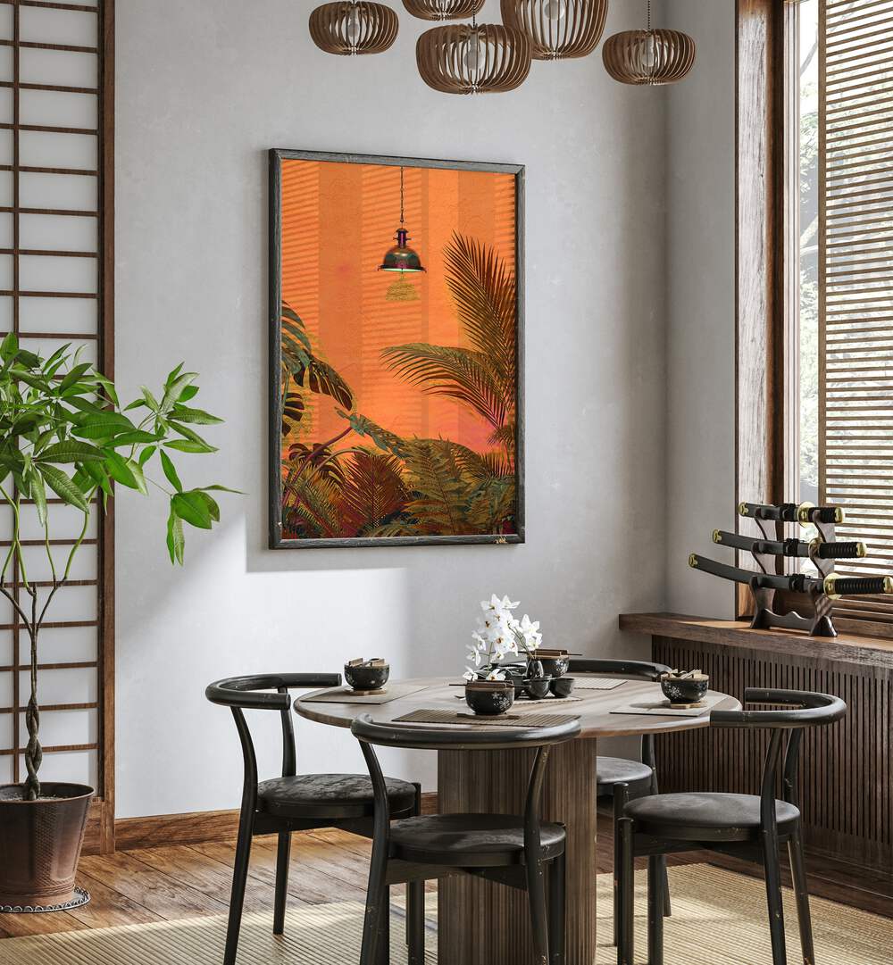 Tropical Wall By Cosmo Zach Surreal Art Prints Surrealism in Oak Wood Plain Frame on a wall behind a dining table