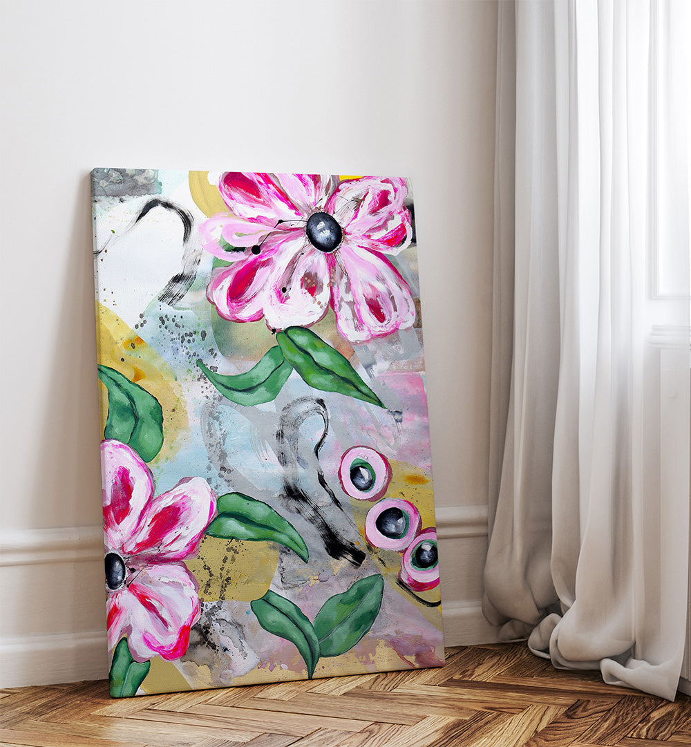 Brighten any room with this vibrant painting of pink flowers and green leaves. The bold palette and delicate botanical details bring a burst of spring to your walls, creating an instant mood boost and a natural focal point in your space.