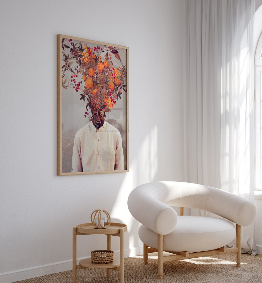 Beautifully framed "BRIGHT BLOOM, SURREAL ART PRINTS" by Frank Moth, showcasing a floral headpiece in surrealism.