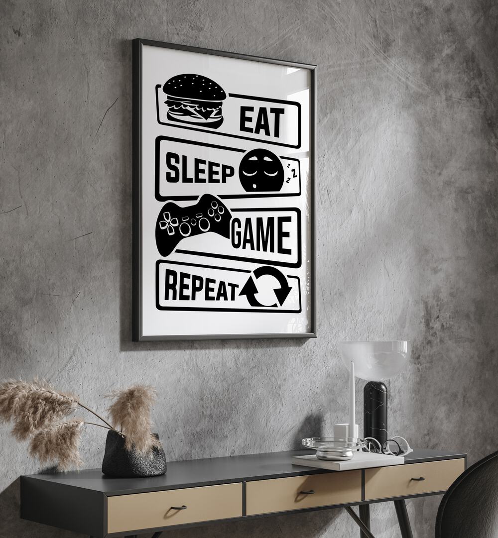 The EAT SLEEP GAME REPEAT III poster is more than just a decoration; it's a statement piece. Celebrate your gaming journey and inspire those around you with this motivational artwork. Whether you're a casual player or a dedicated gamer, this poster is a perfect match for your lifestyle.
