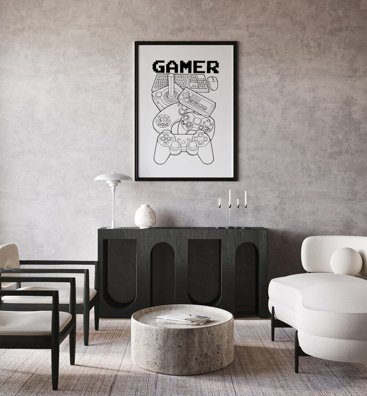 Gamer Gaming Art Painting Artwork in plain black frame beside white sofa