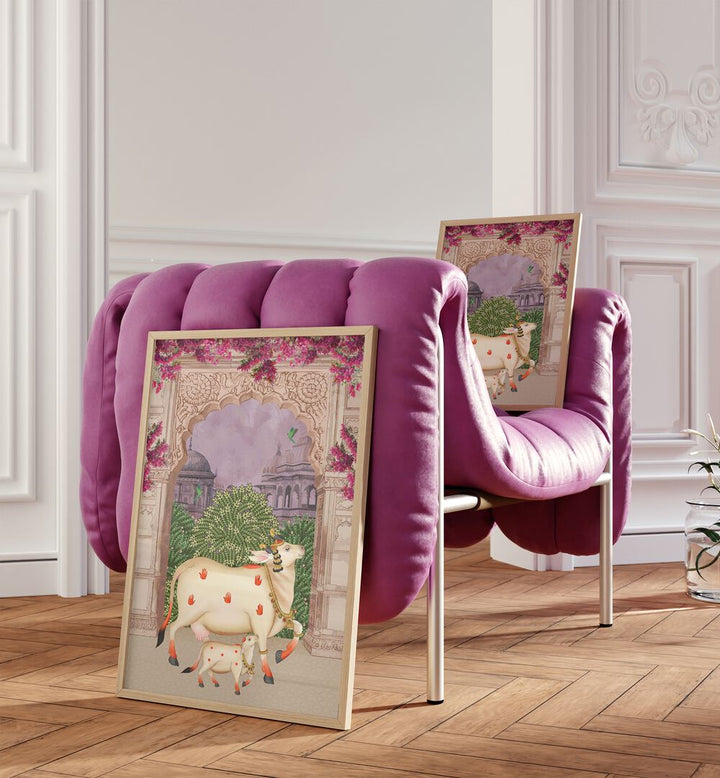 Discover the beauty of COW MOTHER AND CALF'S AFFECTION II, INDIAN ART PAINTINGS, showcasing a tender bond in vibrant colors.