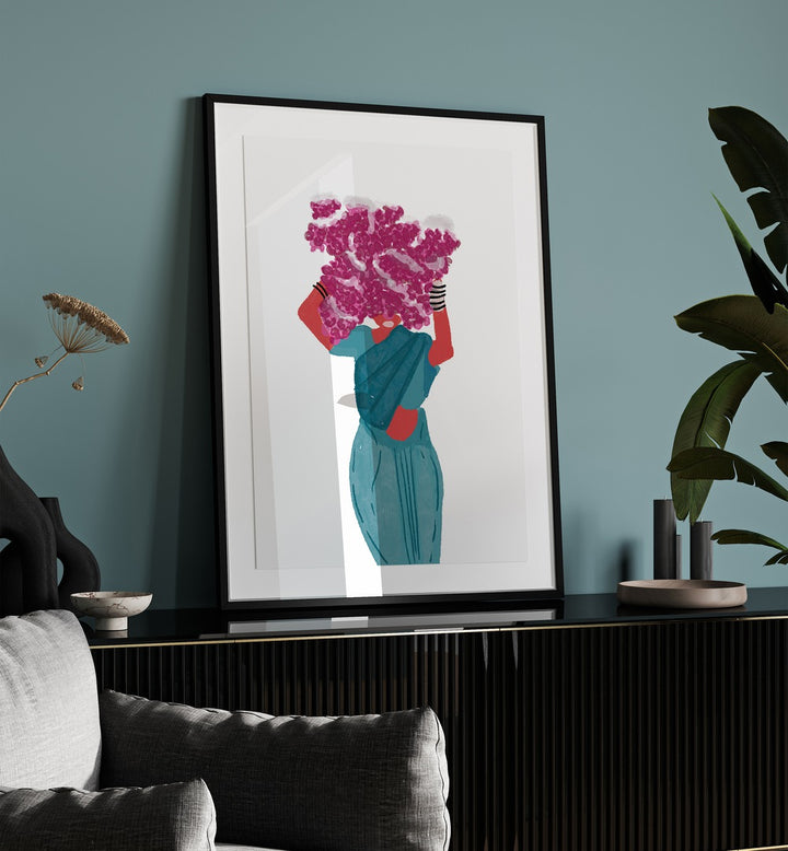 Phoolwalis Of India II By Shreya Roy Chowdary, Indian Art Paintings Artwork in Black Plain Frame placed above a Console Table