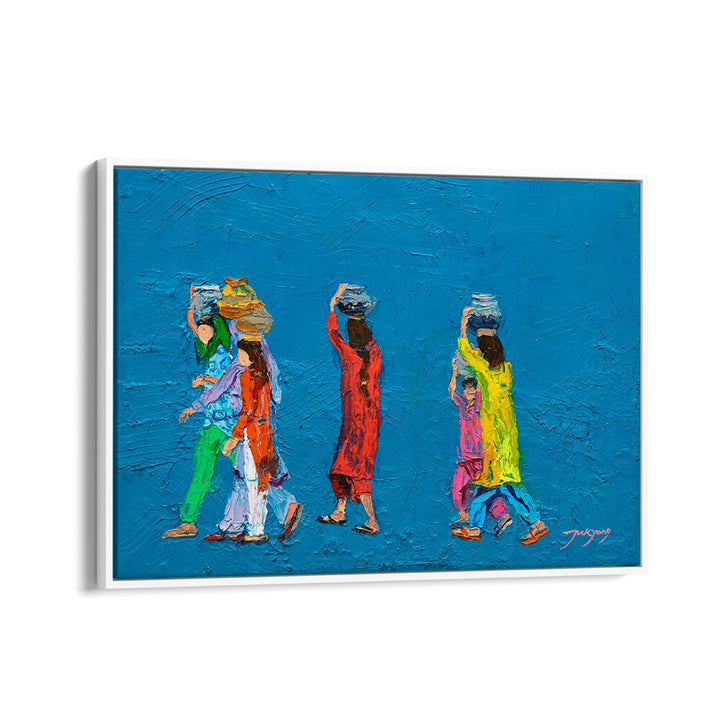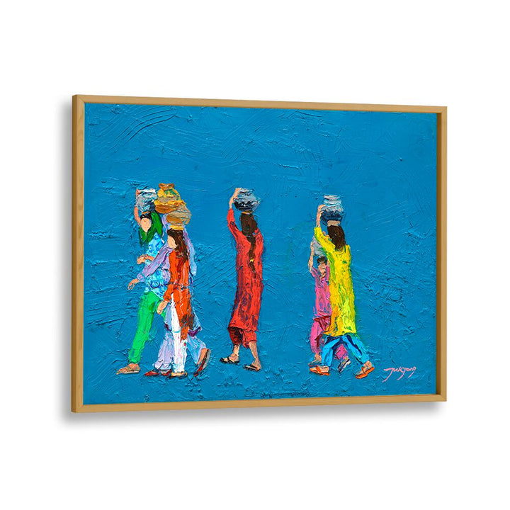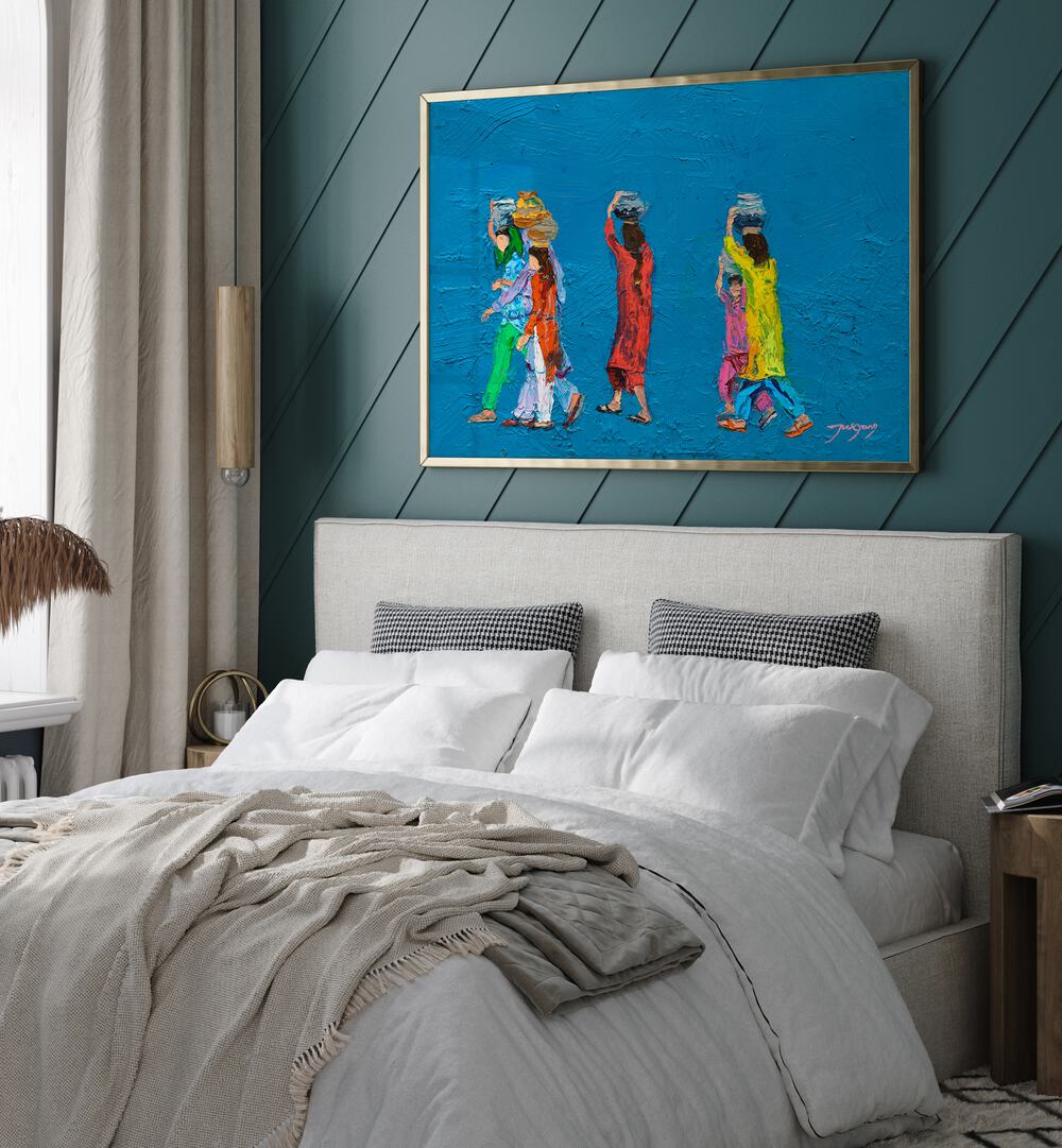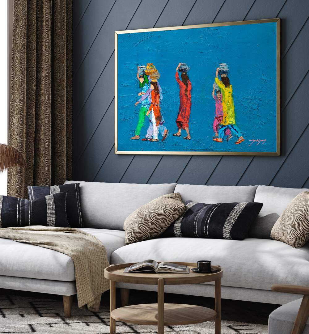 Crafted with care, this hand-painted masterpiece showcases the vibrant earthy Indian color palettes and intricate patterns that define its genre. The colorful Indian paintings depict women gracefully carrying baskets, symbolizing the strength and resilience of women in Indian culture. Each brushstroke tells a story, making this painting a captivating focal point in any room.