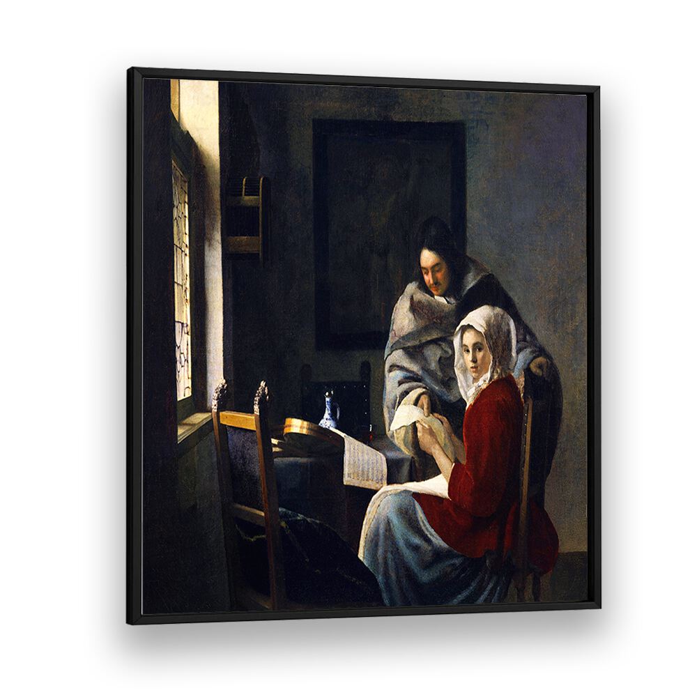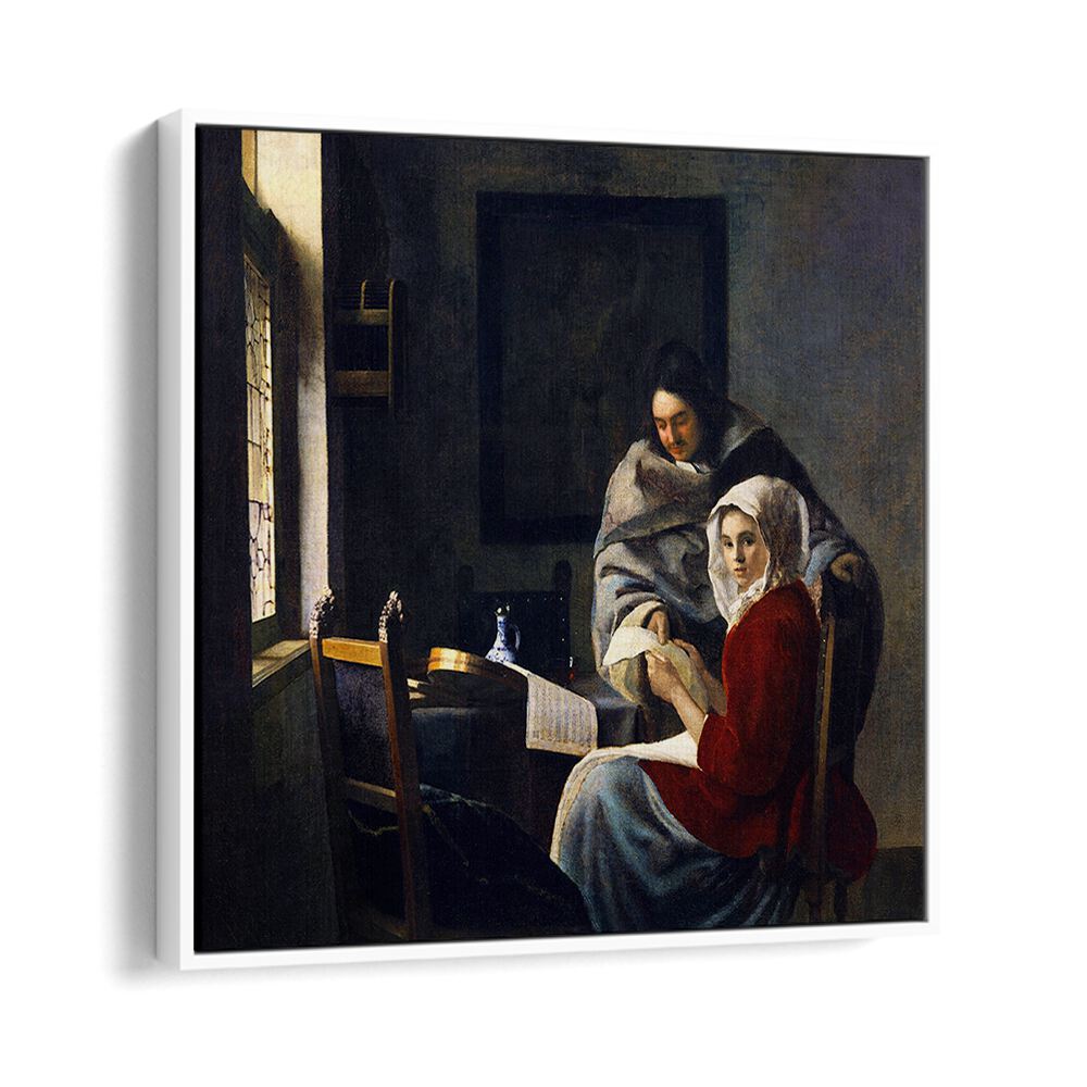Step into the serene world of 17th-century art with the exquisite vintage painting, 'Girl Interrupted at Her Music', crafted by the renowned master Johannes Vermeer around 1660–1661. This masterpiece captures the delicate interplay of music and emotion, inviting viewers to experience a moment frozen in time.