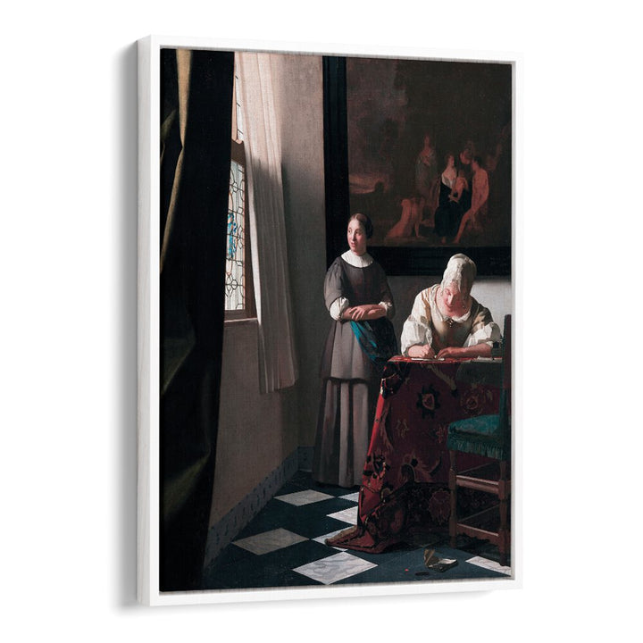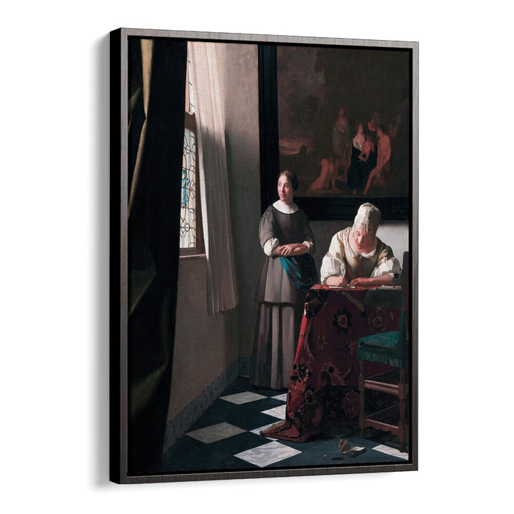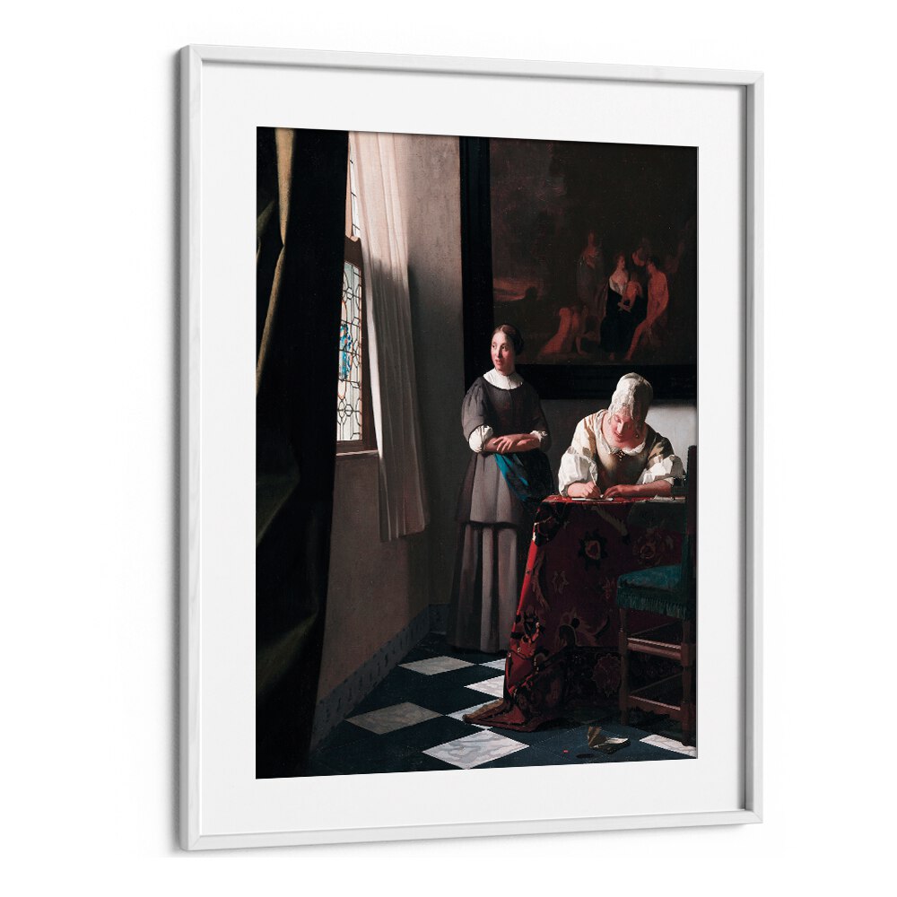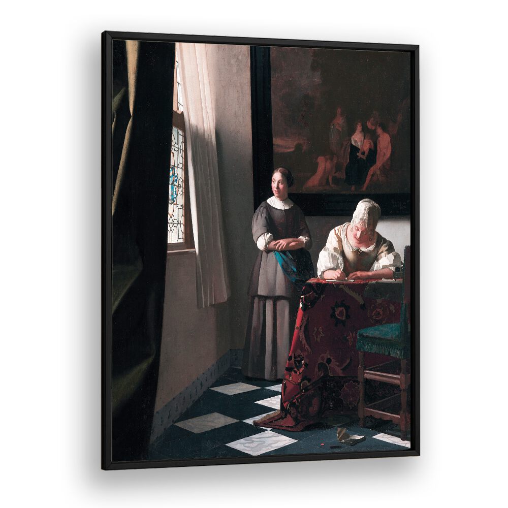 Step into a world of refined beauty with “Lady Writing a Letter with Her Maid” (ca. 1670–1671) by Johannes Vermeer. This exquisite vintage painting captures a moment of intimate conversation and intellectual engagement, showcasing Vermeer’s masterful ability to depict light and texture.