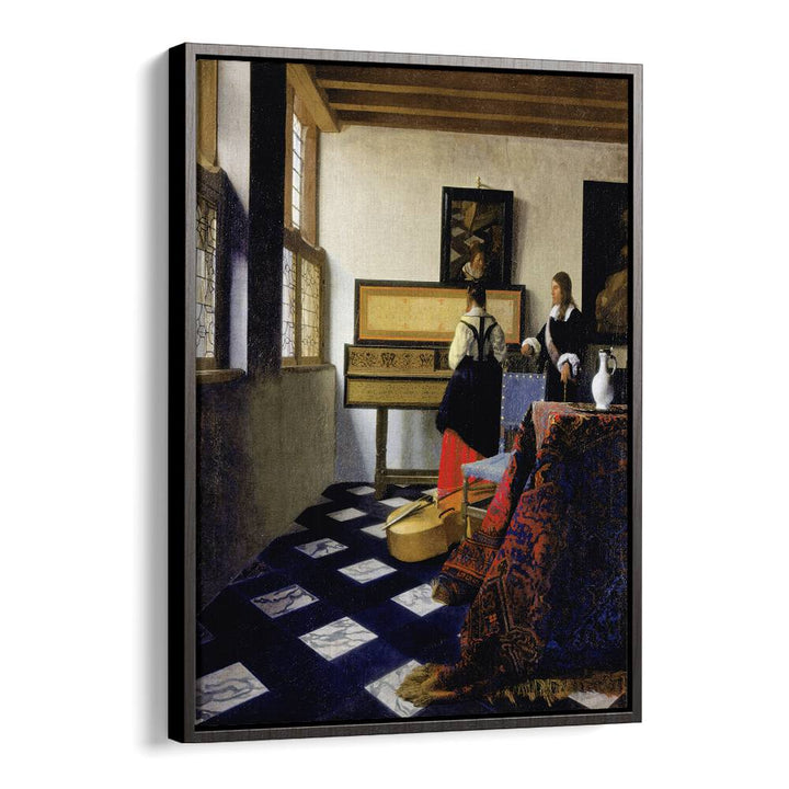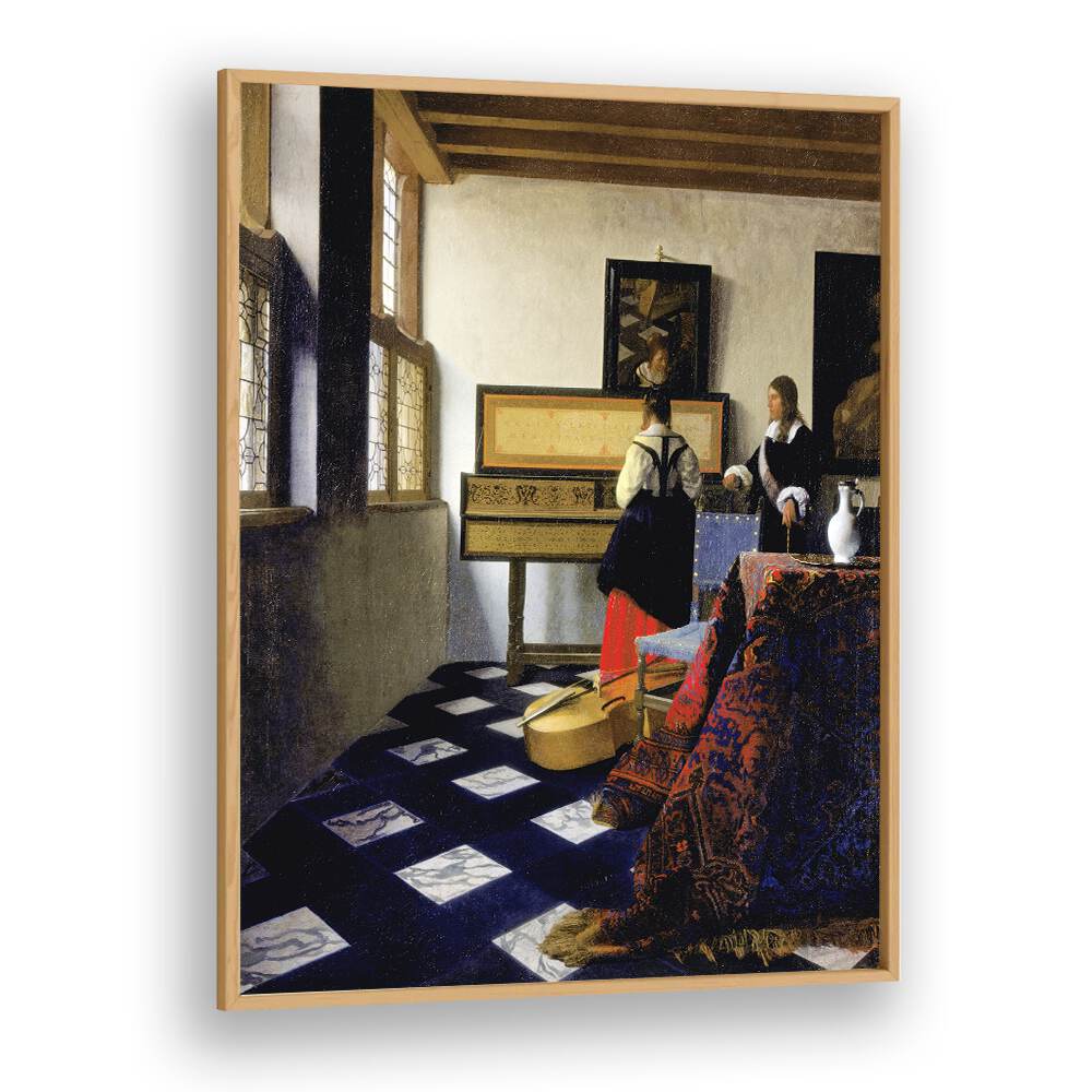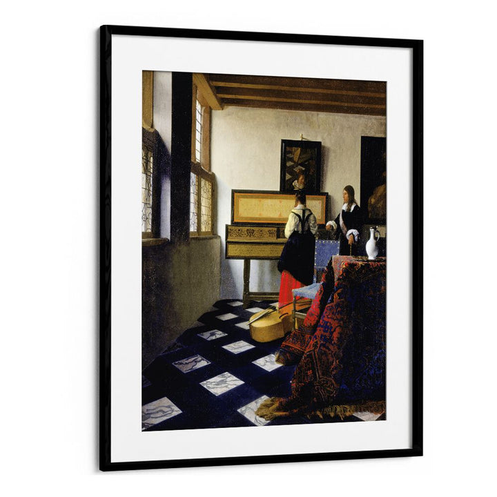 Step into the enchanting world of 17th-century art with this exquisite reproduction of "The Music Lesson", masterfully painted by the renowned artist Johannes Vermeer between 1662 and 1665. This vintage painting captures a moment of grace and sophistication, making it a stunning addition to any art collection or home décor.
