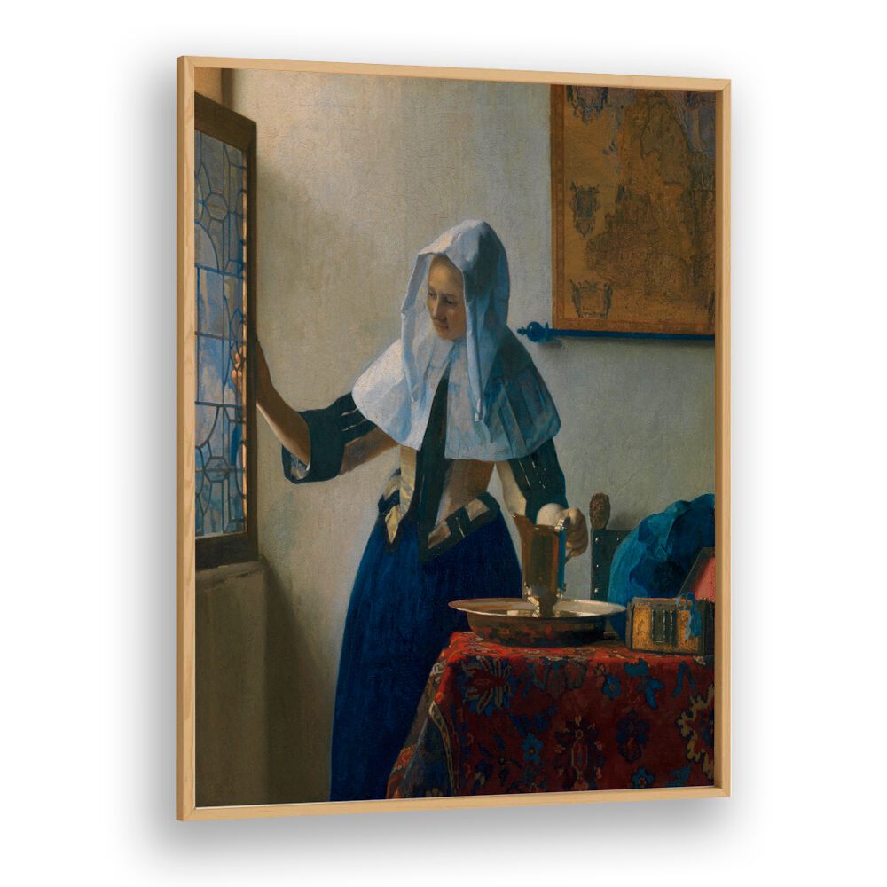 Step into the serene world of 17th-century artistry with the exquisite painting, Young Woman with a Water Pitcher (ca. 1662–1665) by the illustrious Johannes Vermeer. This vintage piece captures a moment of quiet elegance, radiating the tranquility and grace that Vermeer is renowned for.