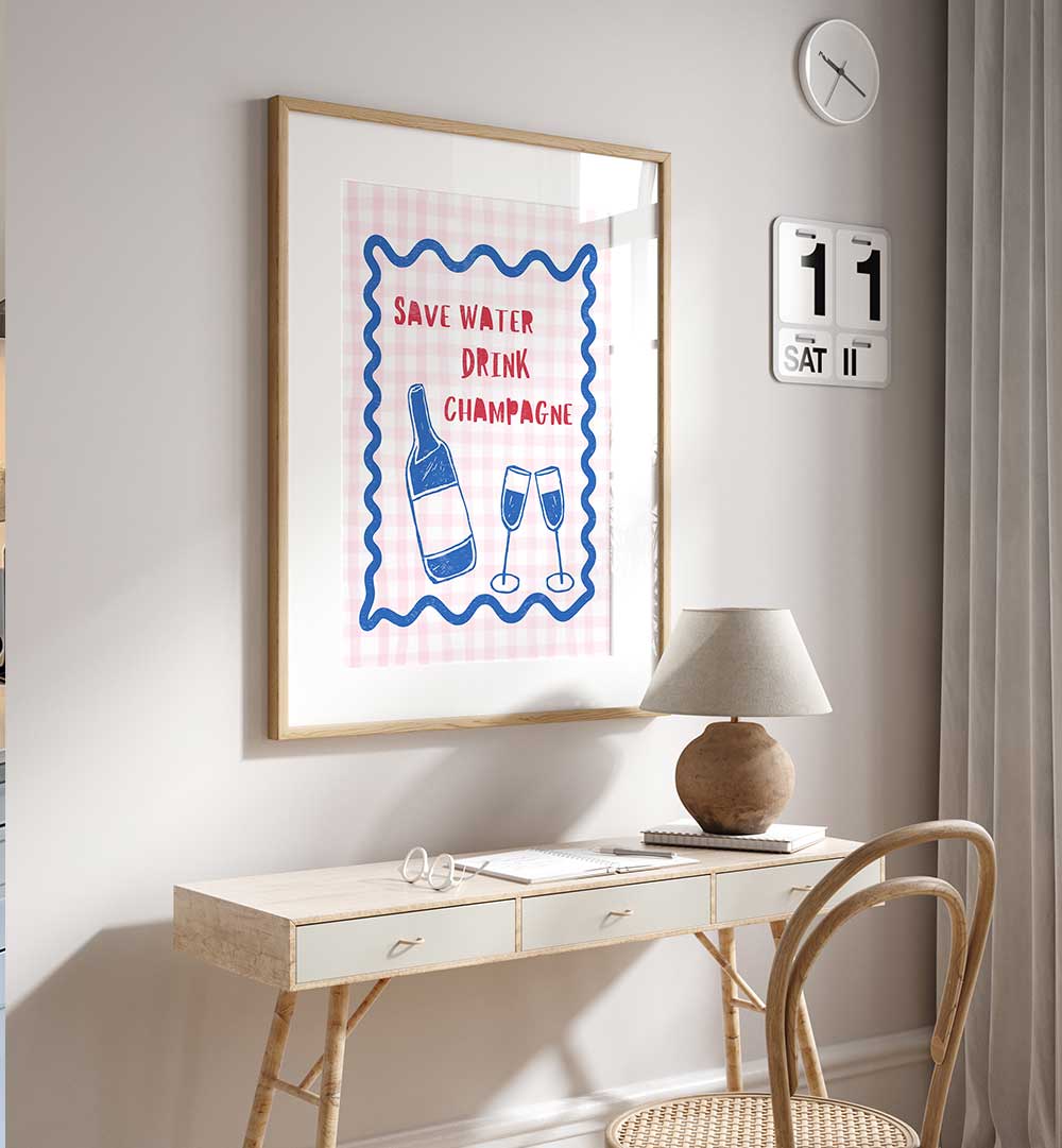 SAVE WATER DRINK CHAMPAGNE — a witty, stylish wall art piece crafted for bars, cafes, and lounges.