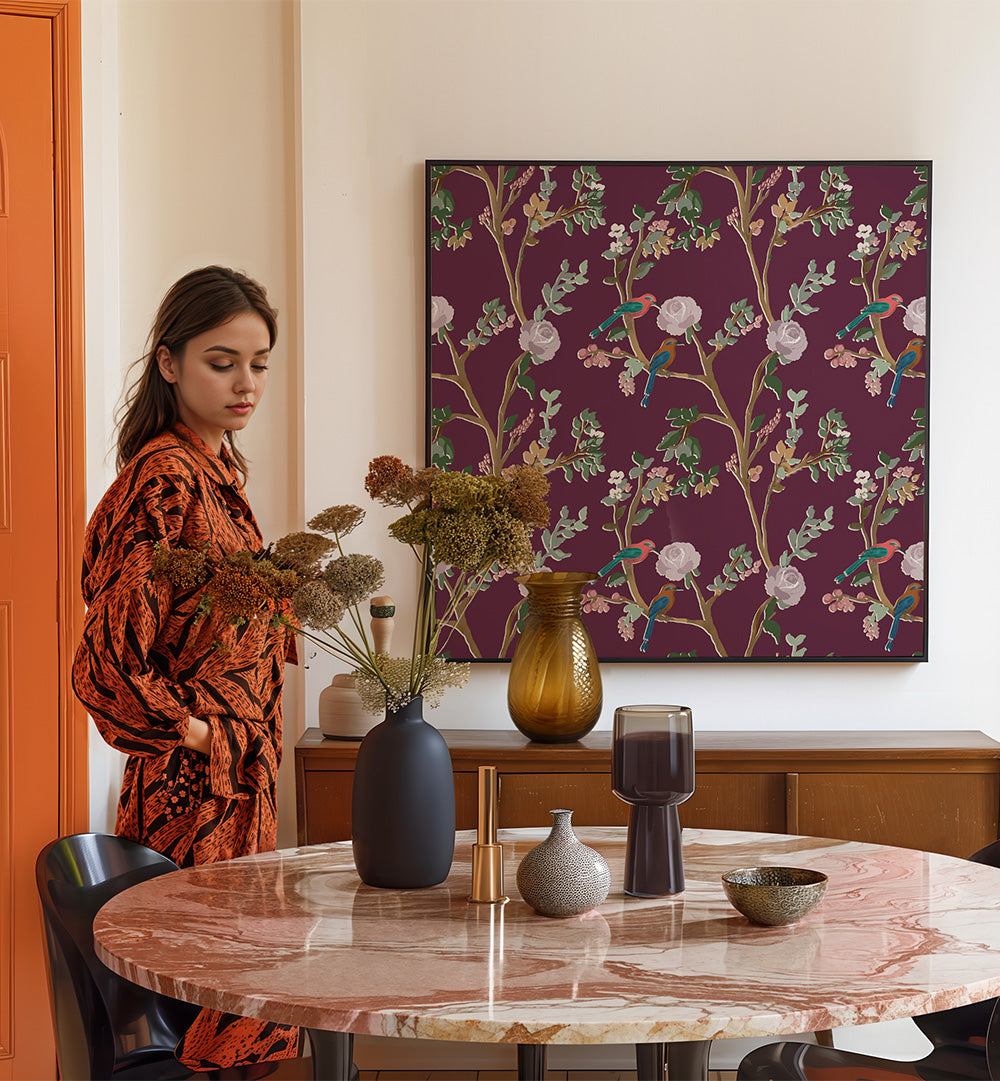 - Contemporary rose-pattern artwork that complements minimalist, mid-century, and bohemian interiors