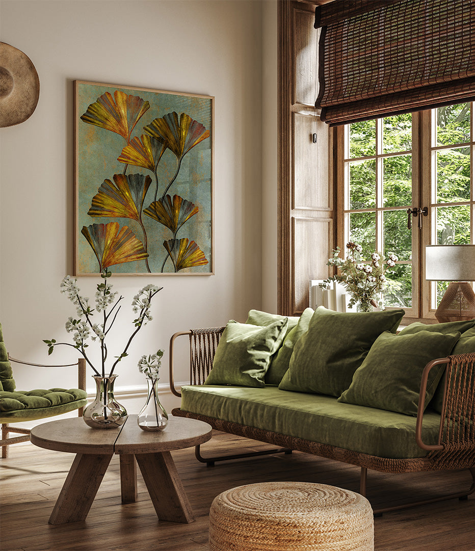 Introducing GINKO BILOBA 2: Floral — a botanical-inspired painting that fuses the graceful shape of ginkgo leaves with lush floral forms. This floral flower painting invites nature indoors, delivering a serene focal point for any room.