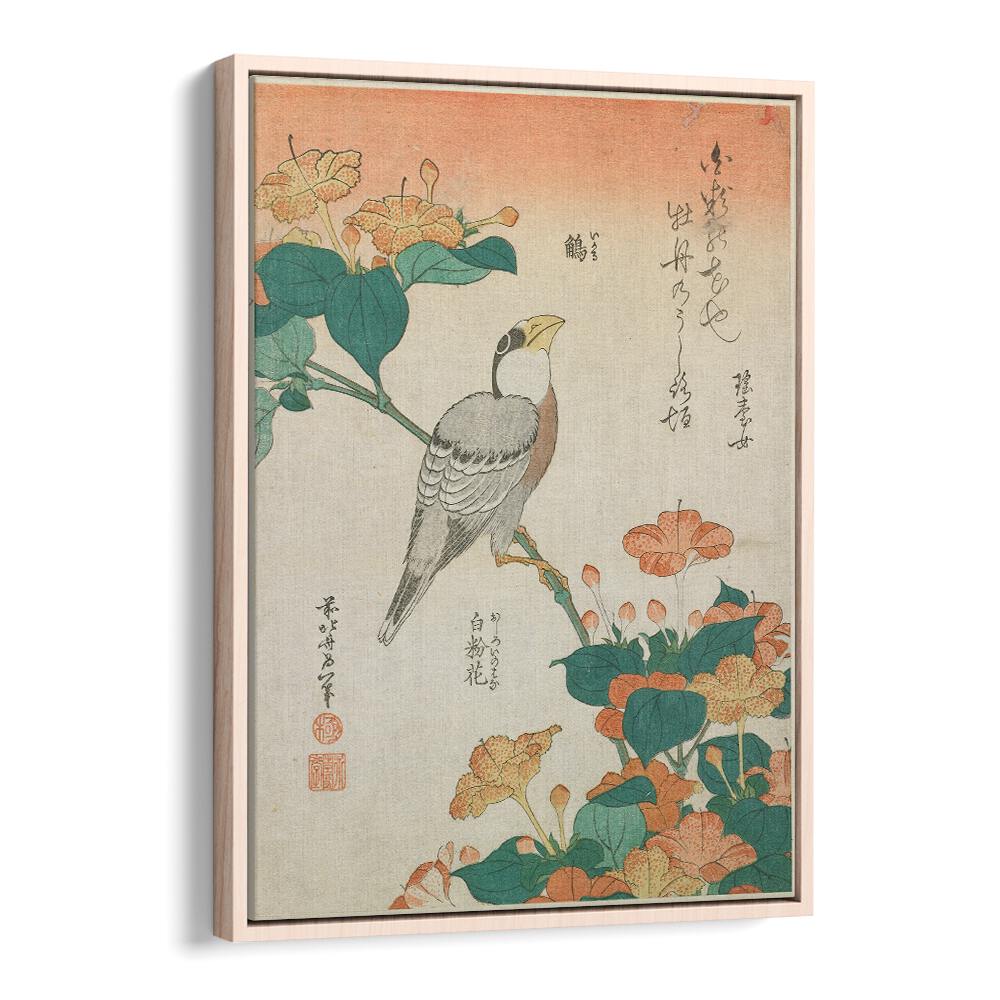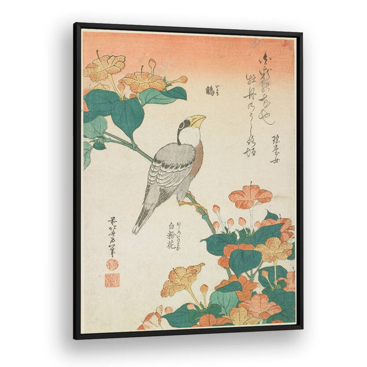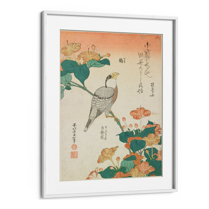 Immerse yourself in the exquisite beauty of HAWFINCH AND MARVEL-OF-PERU (CA.1834), a remarkable piece by the renowned Japanese artist Katsushika Hokusai. This stunning painting encapsulates the delicate interplay of nature and artistry, showcasing Hokusai's unparalleled skill in bringing flora and fauna to life.