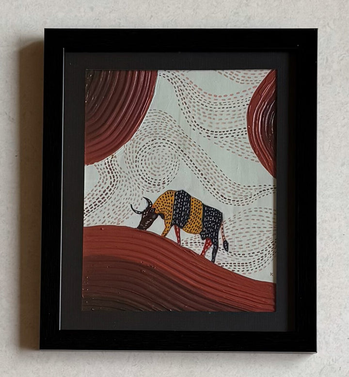 This Gond inspired contemporary triptych portrays the humble cow watching the ever shifting patterns of the world around.