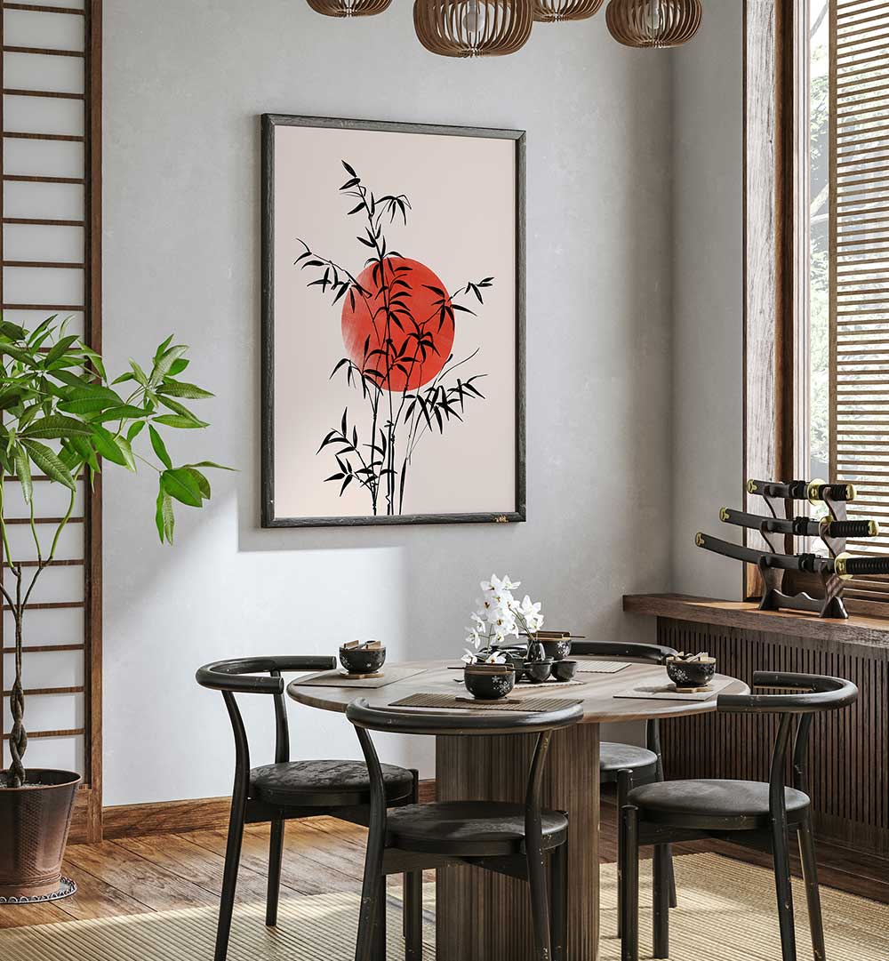 - Iconic East-meets-Nature motif — bamboo imagery paired with a striking red sun for a culturally rich focal point.