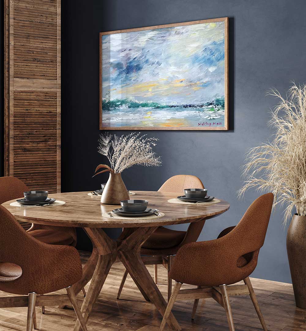 The composition blends expansive scenery with intimate details, using a restrained palette of cool silvers, soft blues, and warm neutrals to create a timeless, versatile focal point. Its serene atmosphere makes it easy to pair with a variety of décor styles while adding a touch of refined elegance.