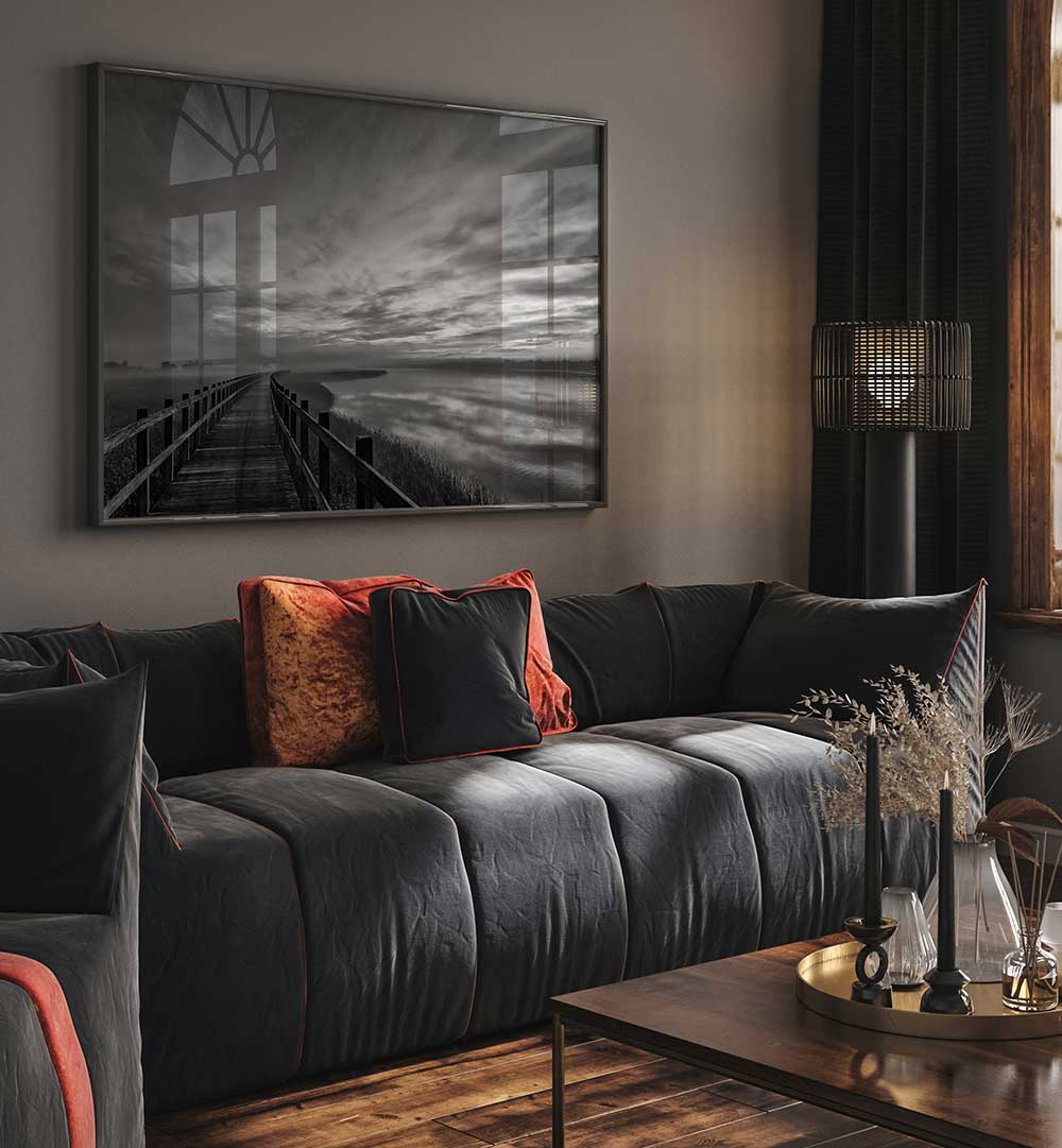 WOODEN FOOTBRIDGE DARK photography print—a moody, cinematic image that captures a quiet moment on a weathered wooden bridge. This art print brings natural texture and atmospheric contrast to any space, making it a compelling centerpiece for modern interiors.
