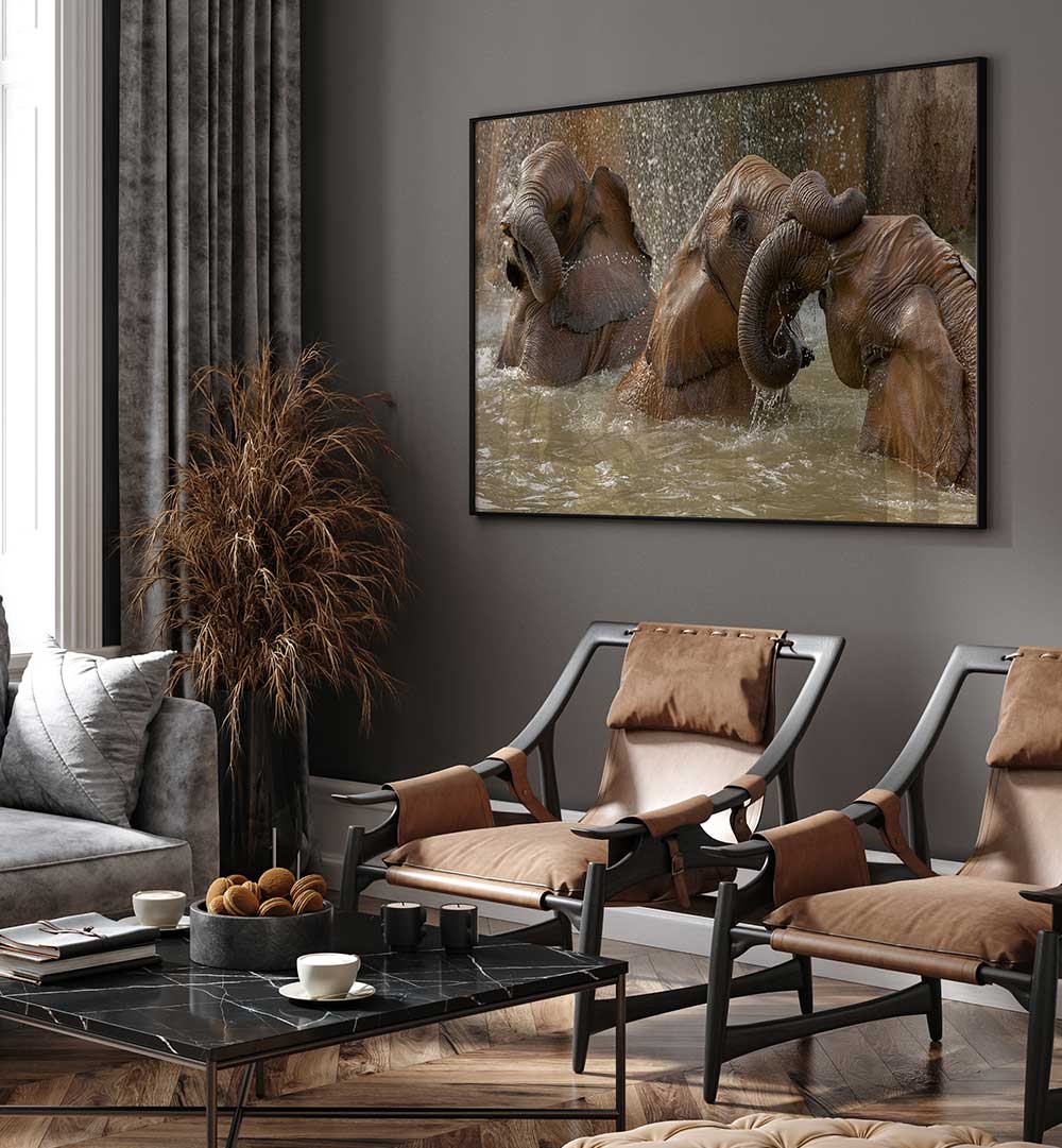 Playful elephants enjoy a splash in water with the enchanting BATH TIME PLAY, PHOTOGRAPHY PRINTS for your home.