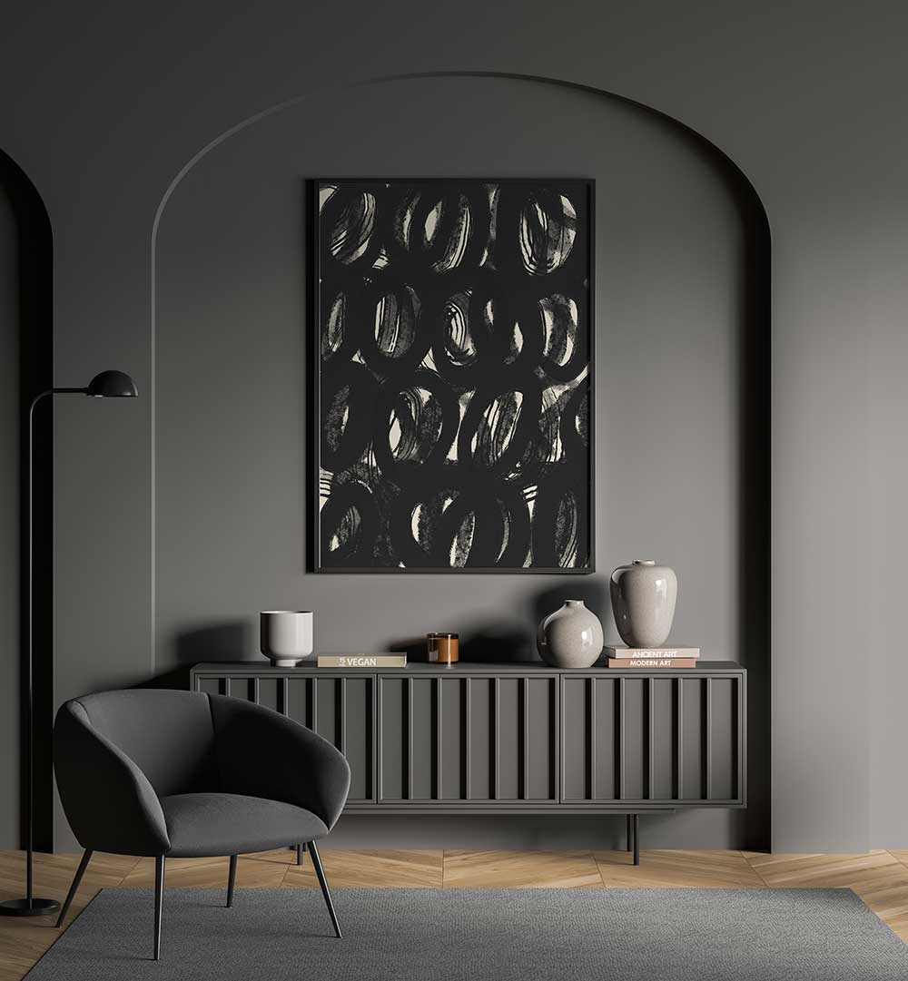 Order today and transform your walls with this striking black abstract brush scribble, a timeless addition to any modern space.