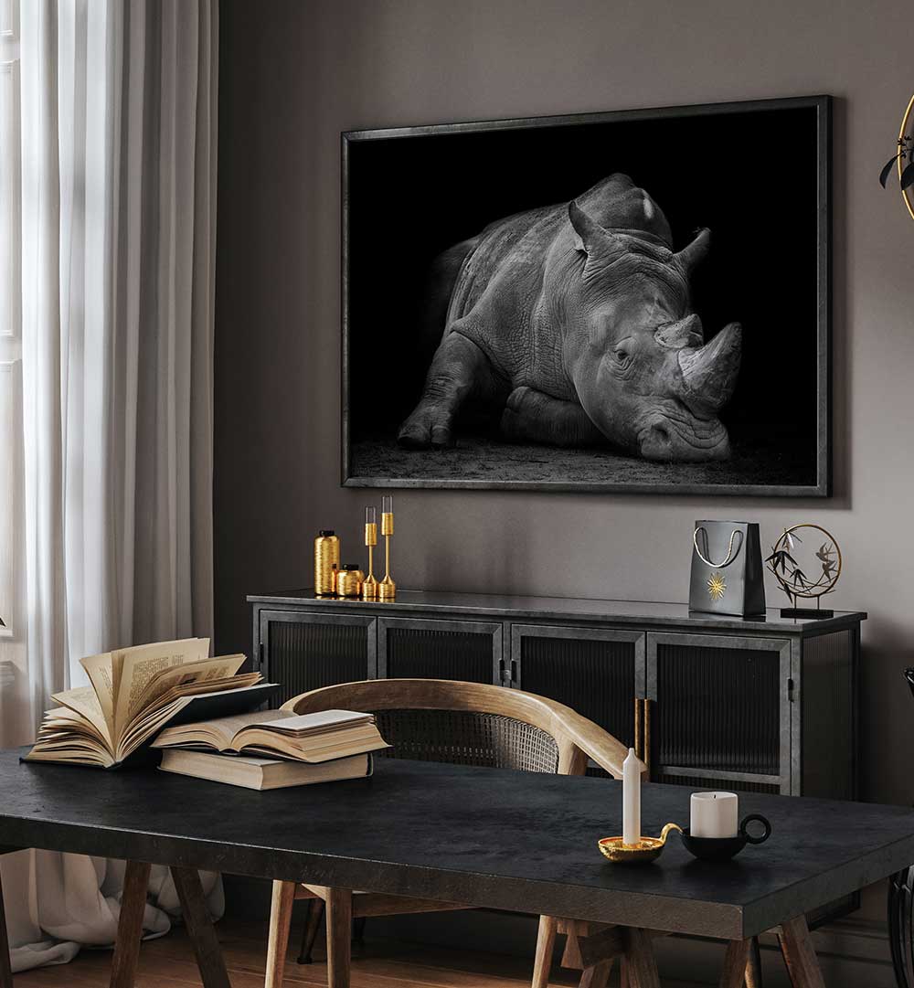 Experience the raw emotion and beauty of wildlife through the lens of "Defeated by Fegari." This stunning photograph captures a weary rhinoceros, a powerful symbol of the struggles faced by endangered species in their fight for survival.