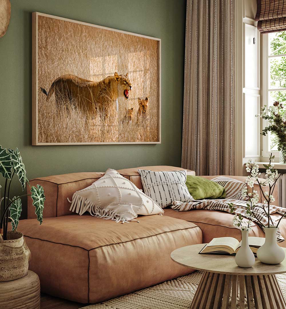 Breathtaking DONT DISTURB ME, PHOTOGRAPHY PRINTS showcase a fierce lioness and her cubs in golden grasslands.