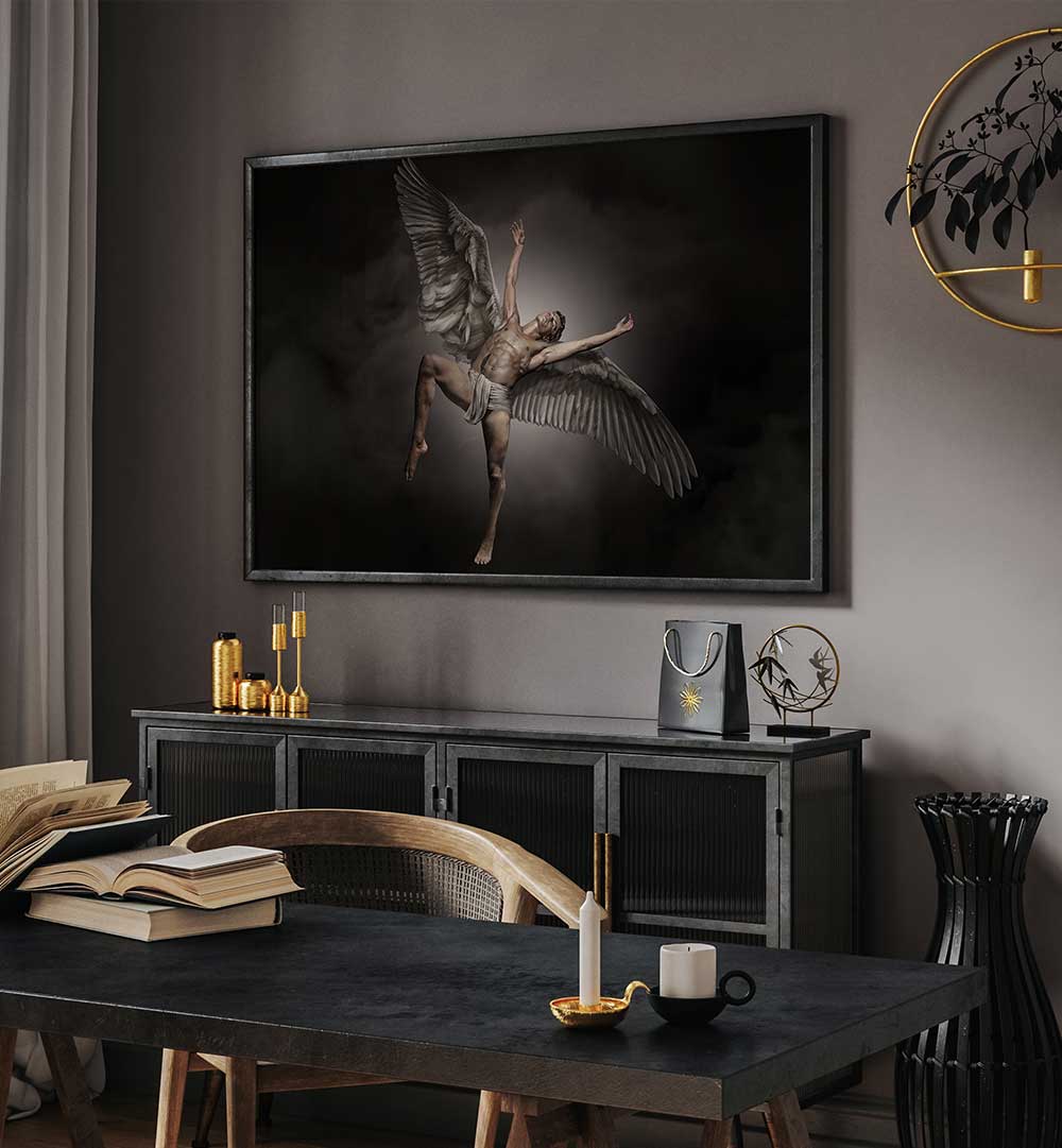 This art print is not just about aesthetics; it’s about creating an ambiance that reflects your unique personality and artistic taste. Whether you're a seasoned art collector or a newcomer, the Fallen Ikarus serves as a beautiful addition to any setting. Make a bold statement and let your walls tell a story.