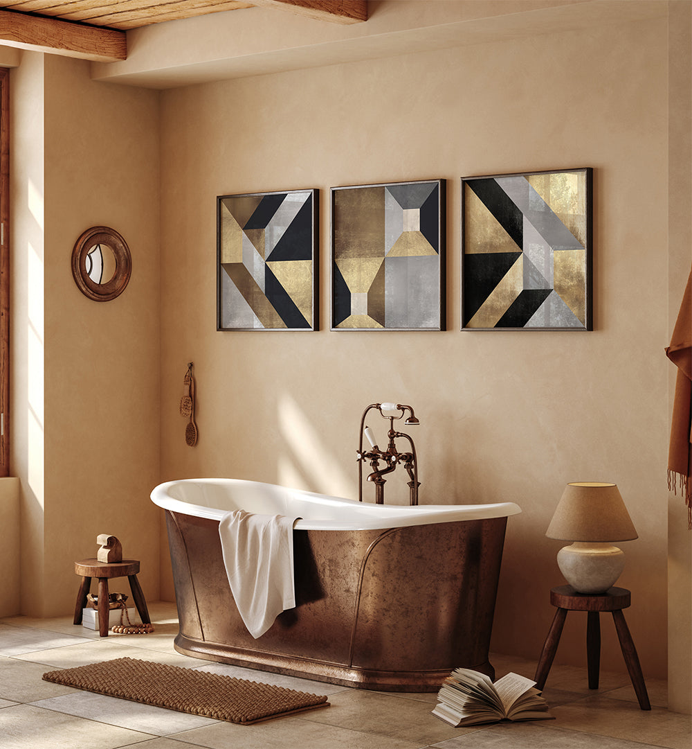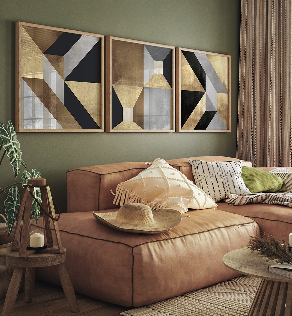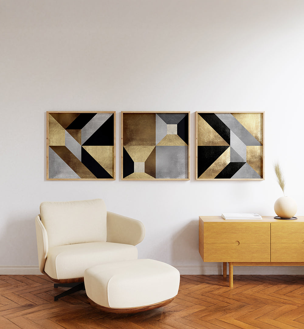 Shop the GOLDEN COMPASS SERIES now and transform your walls with radiant, three-panel artistry.