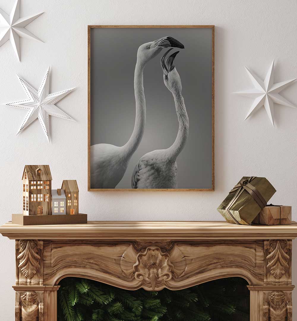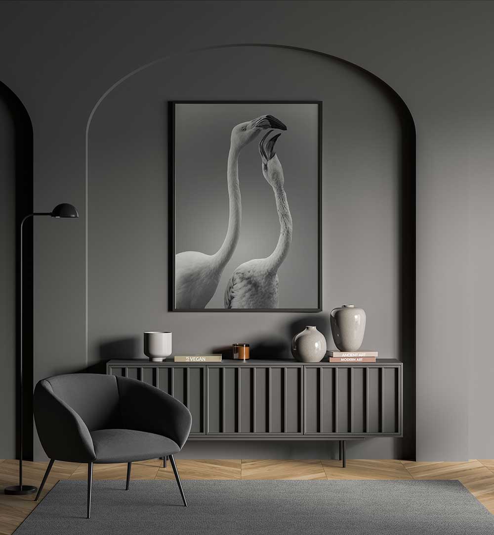 - Timeless Beauty: The intricate feathers of the flamingos are meticulously showcased in monochrome, lending a classic and sophisticated charm to your space.