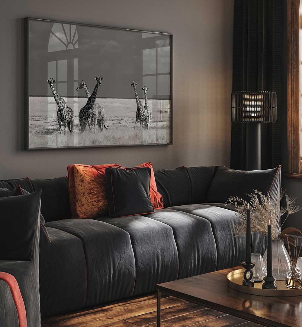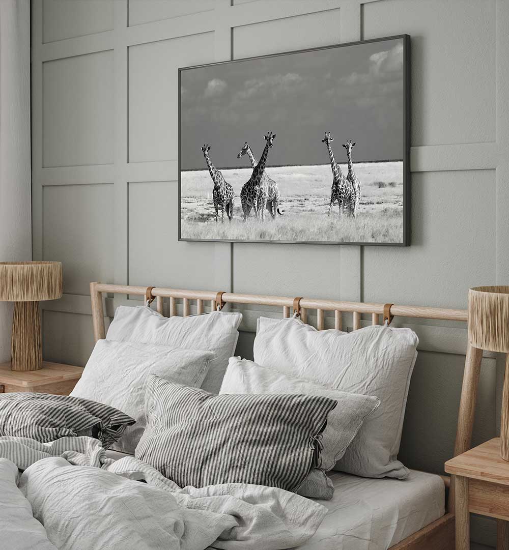 Elegant black and white photography print featuring giraffes, perfect for fans of LOOK GIRL STRANGE ANIMALS, PHOTOGRAPHY PRINTS.