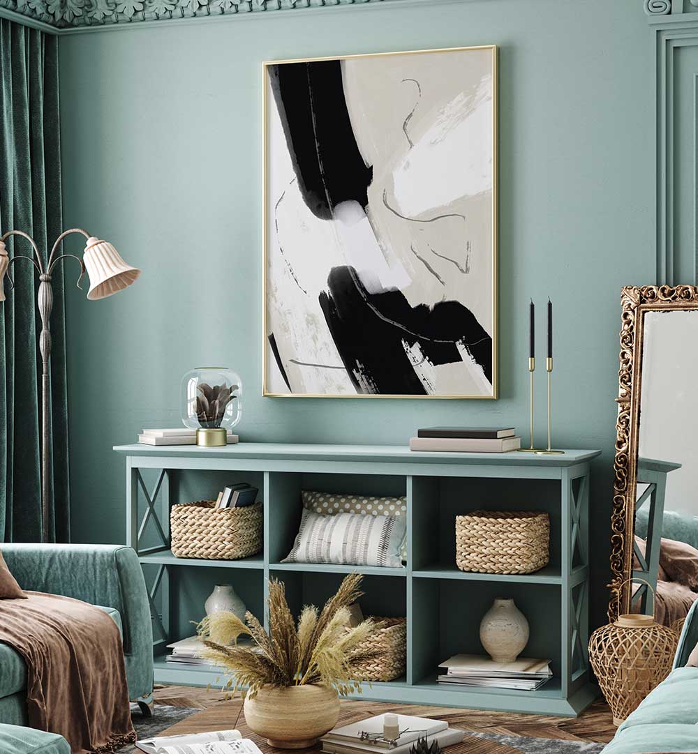 Designed for contemporary interiors, these abstract paintings fuse geometric form with fluid motion to create a versatile piece that complements both serene and energetic decors. The monochrome palette offers timeless elegance, allowing the artwork to harmonize with wood, metal, and glass accents while enhancing natural light and atmosphere.