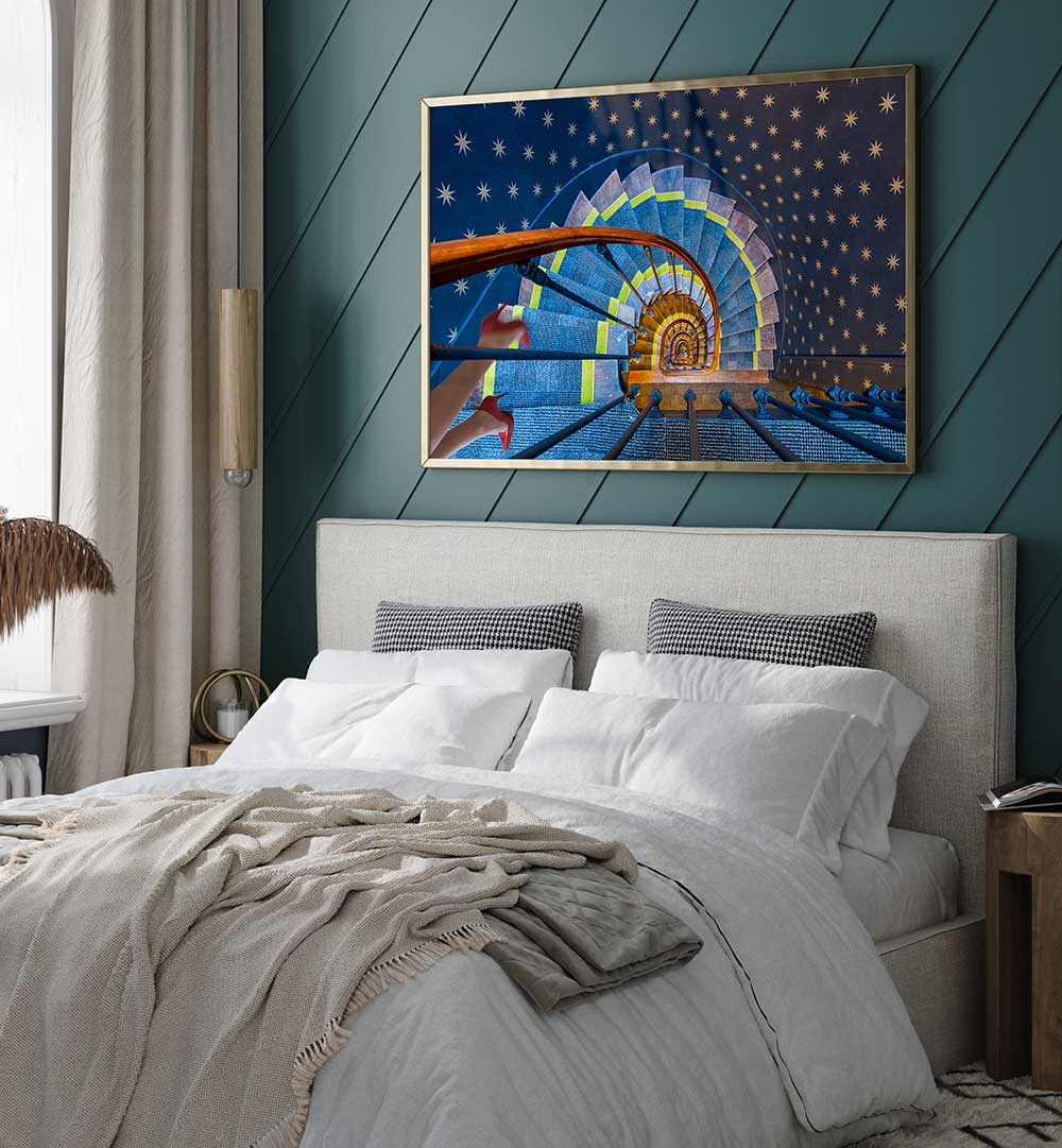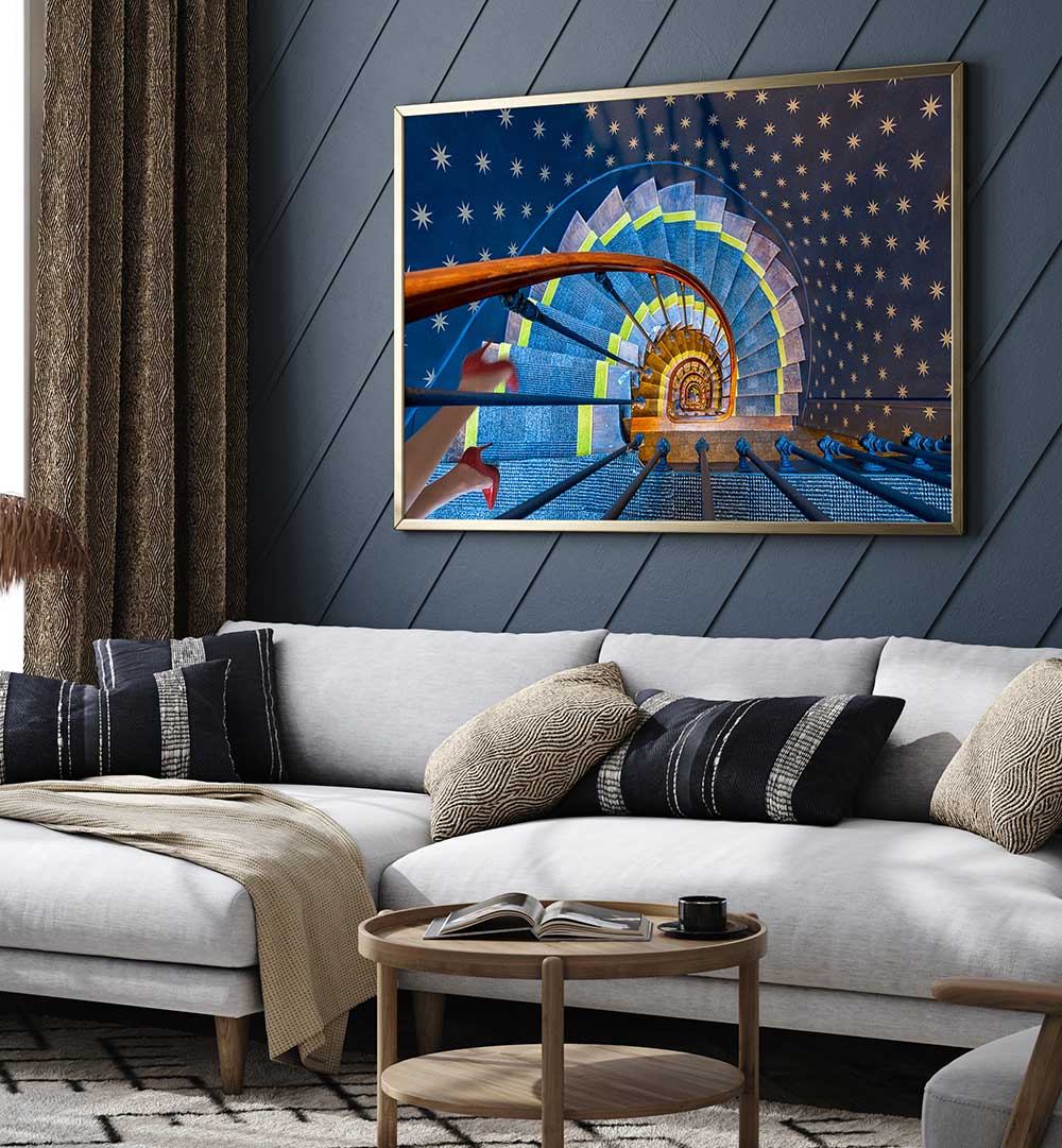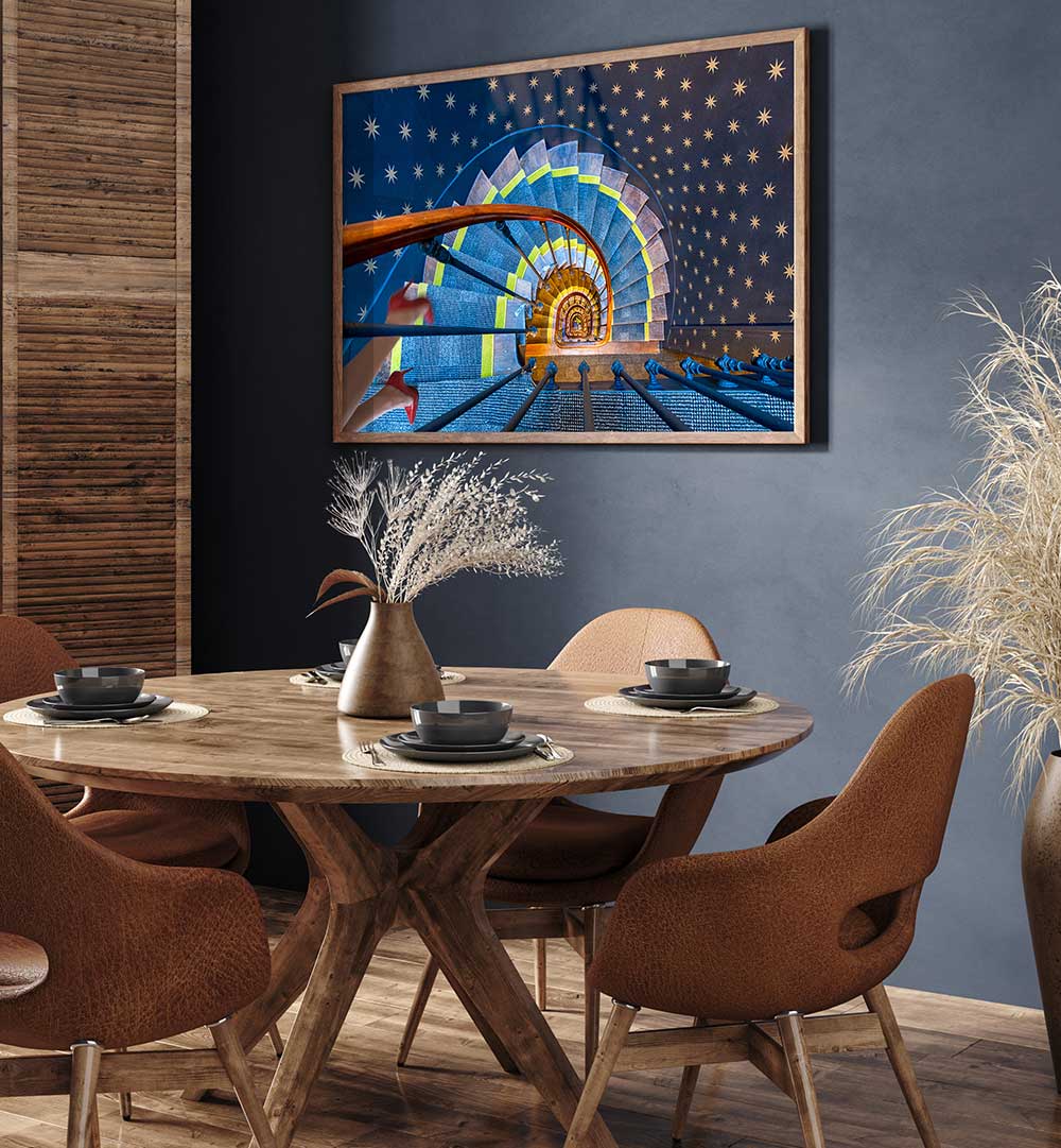 Transform your space with THE ESCAPE, PHOTOGRAPHY PRINTS showcasing stunning spiral staircase artwork.