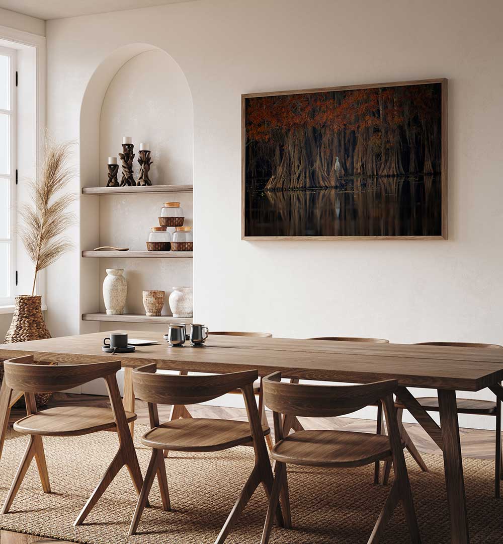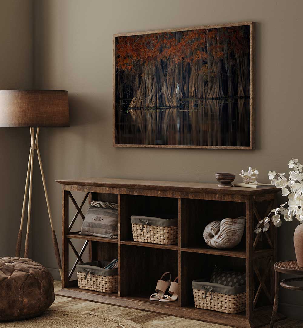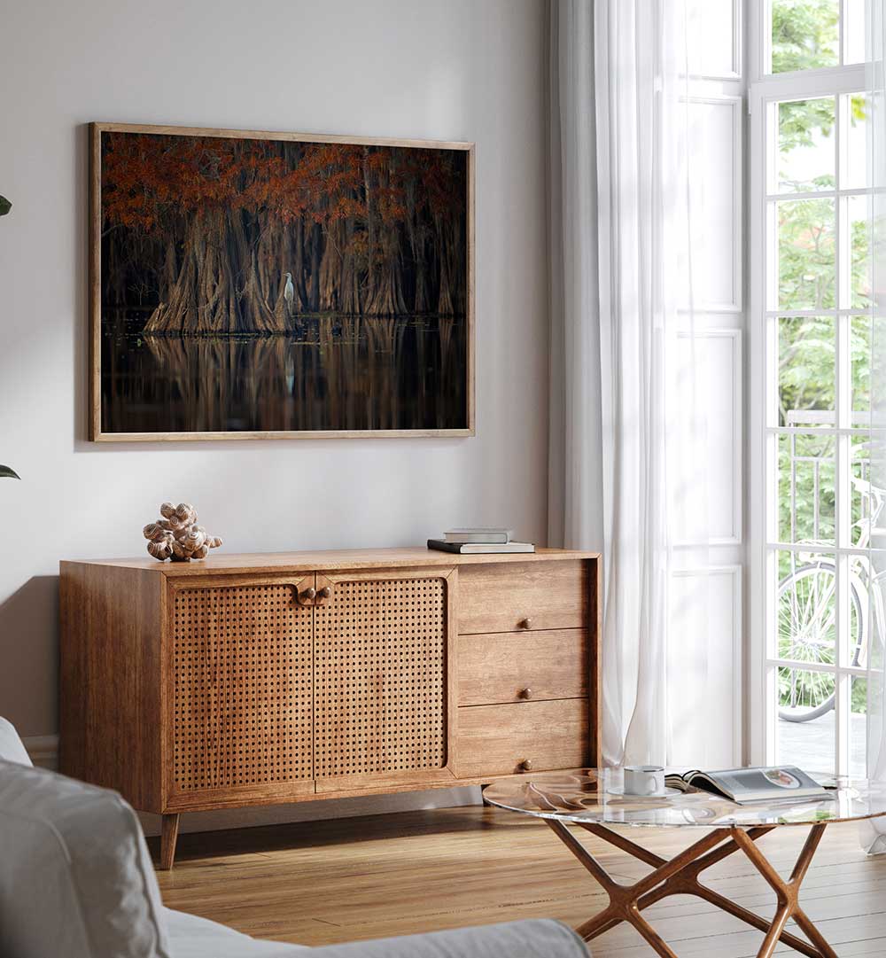 Serene cypress trees reflect in still waters, showcasing TRANQUIL LAKE, PHOTOGRAPHY PRINTS for a peaceful ambiance.