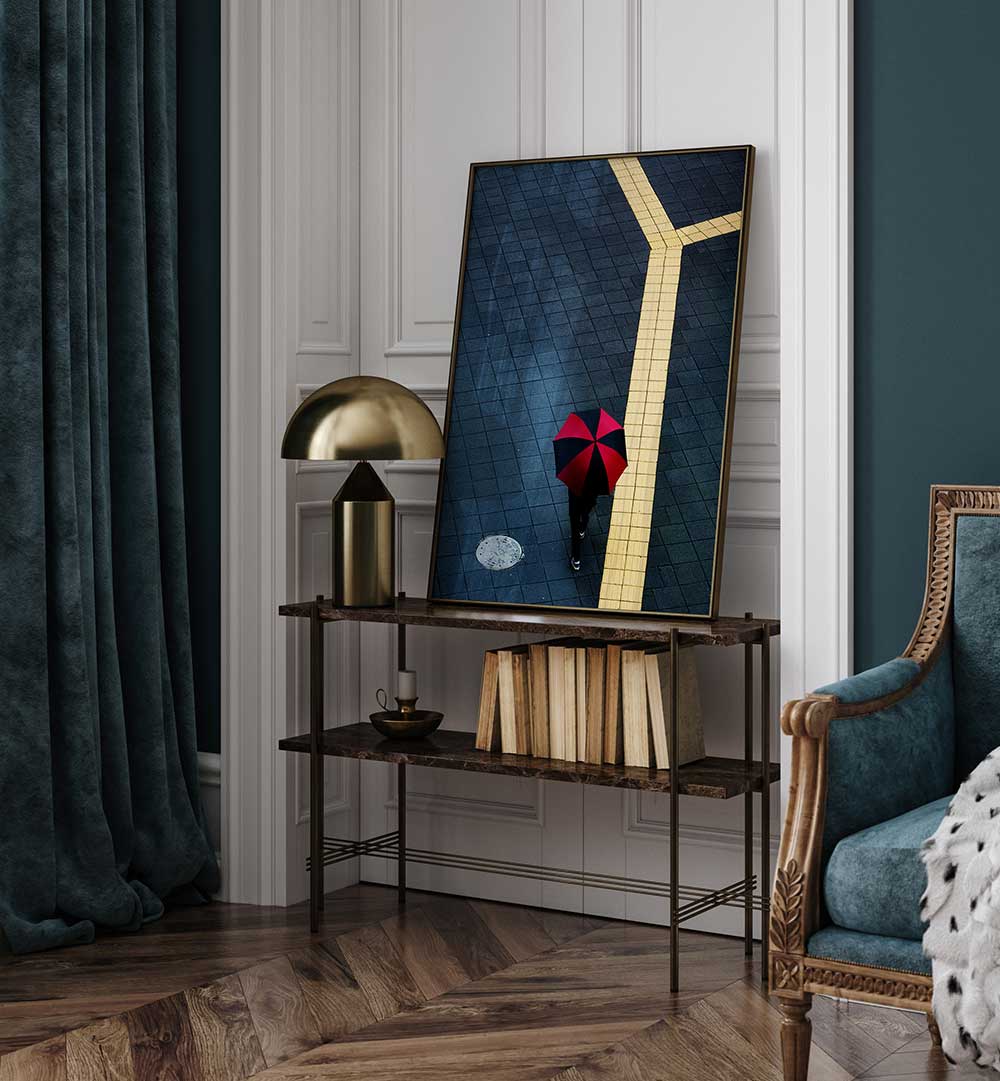 Explore urban energy with Y, PHOTOGRAPHY PRINTS featuring a striking image of a person with an umbrella on city streets.