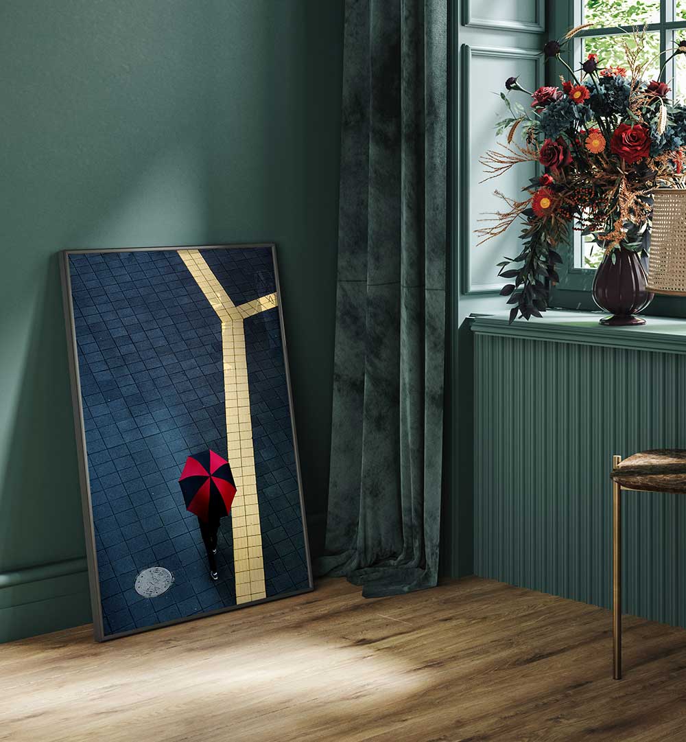 Urban scene featuring a person with a red umbrella, showcasing Y, PHOTOGRAPHY PRINTS' captivating street photography.