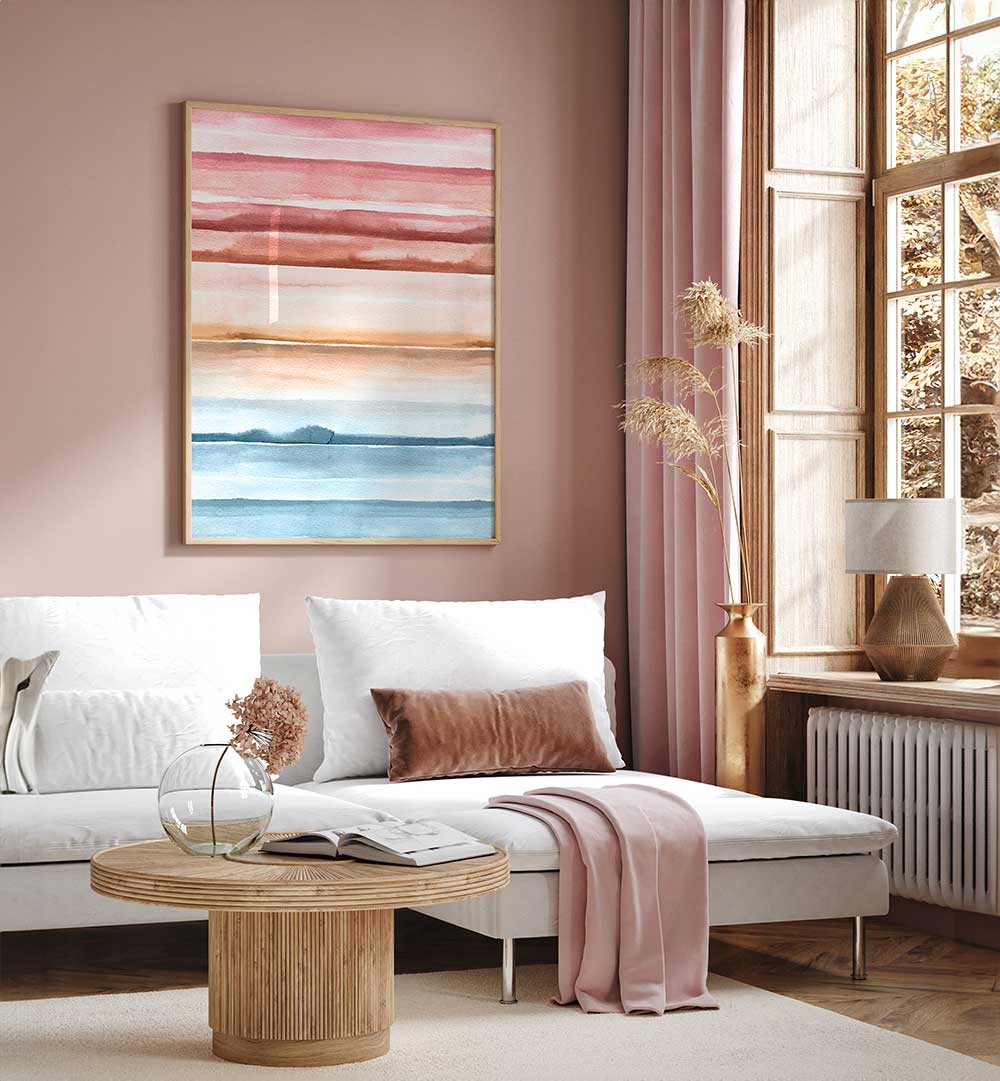 Introducing WATERCOLOR STRIPES SUMMER SUNSET II, ABSTRACT PAINTINGS — a captivating piece of wall art that fuses fluid watercolor gradients with crisp striped geometry to echo the warmth of a summer evening.